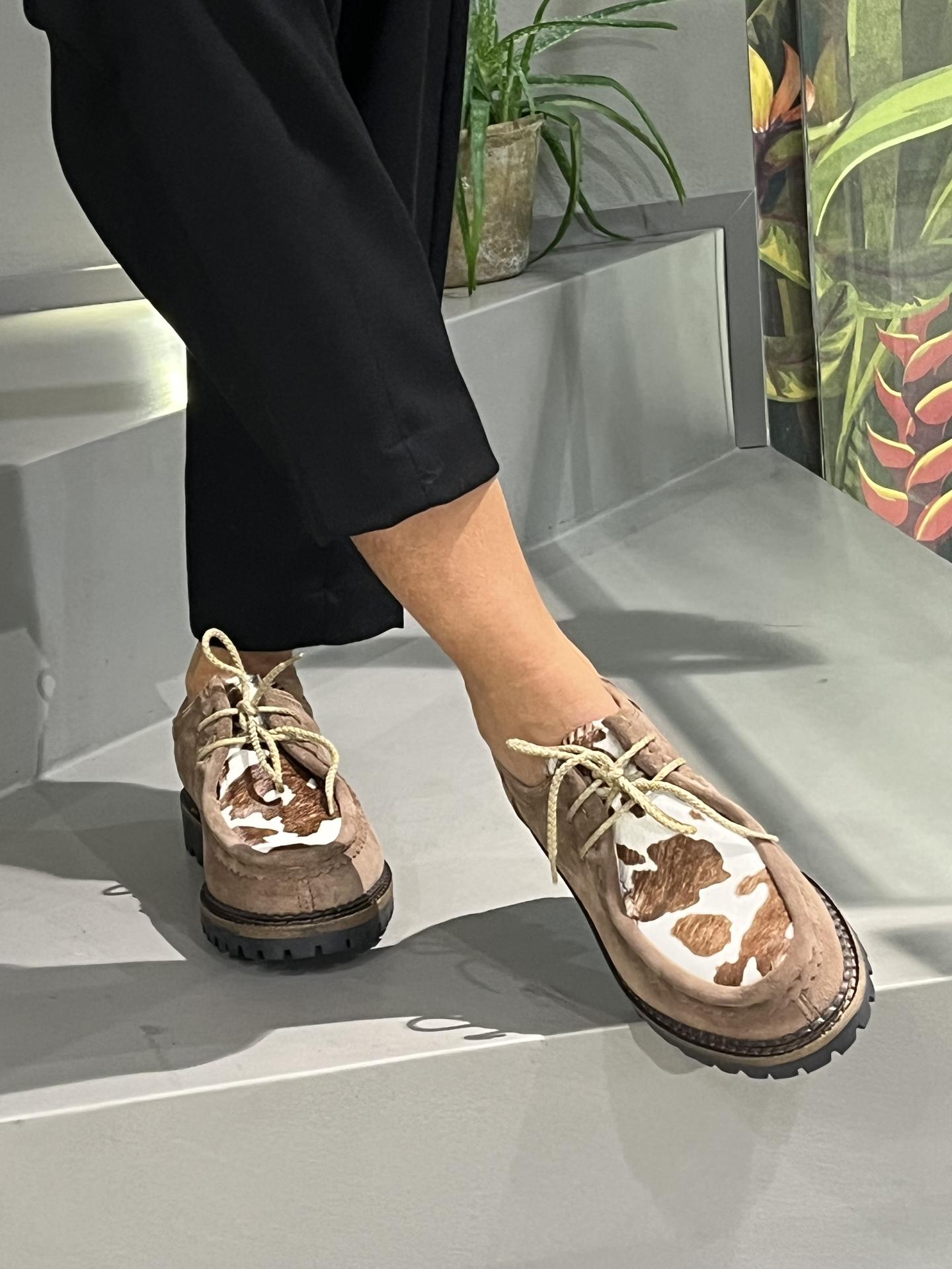 SCARPA STRINGATA IN CAMOSCIO E VASCHETTA IN CAVALLINO MUCCATO. TACCO 30, FONDO GOMMA. MADE IN ITALY
