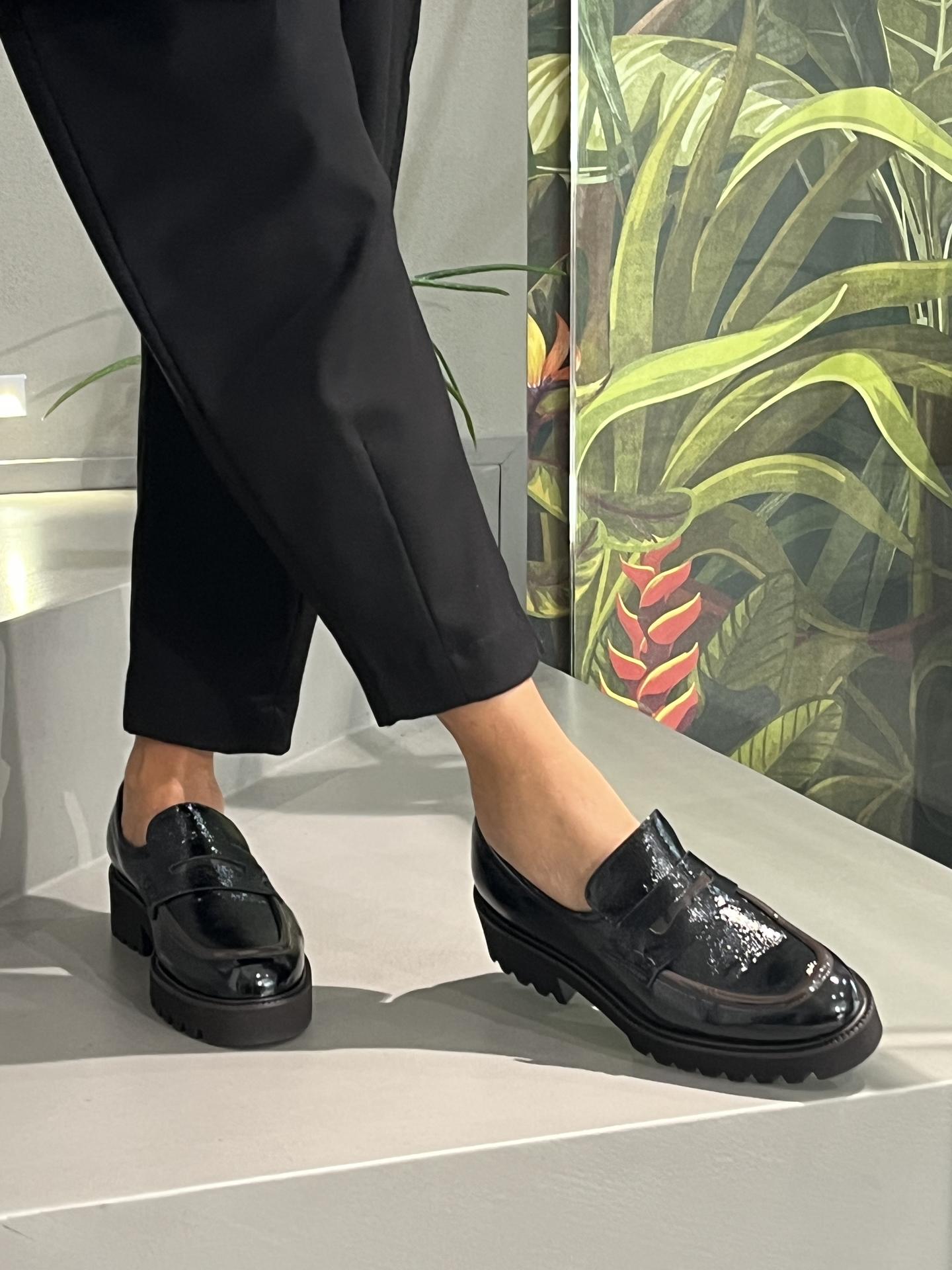 MOCASSINO IN NAPLAK (NAPPA LACCATA) CON INSERTO ELASTICO SU COLLO DEL PIEDE PER UNA PERFETTA AVVOLGENZA. TACCO 45, PLARTFORM 20, FONDO GOMMA LIGHT. MADE IN ITALY
