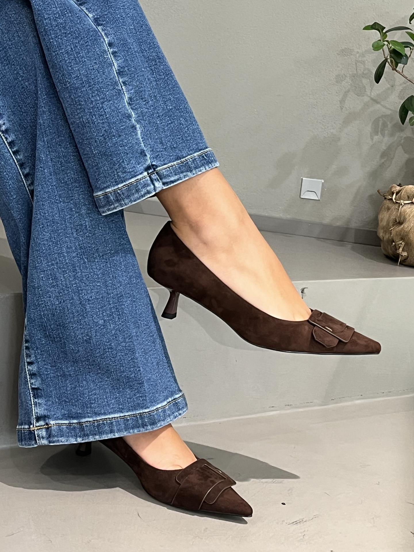 DECOLLETE' IN CAMOSCIO CON FODERA PELLE. TACCO 45, FONDO CUOIO E GOMMA