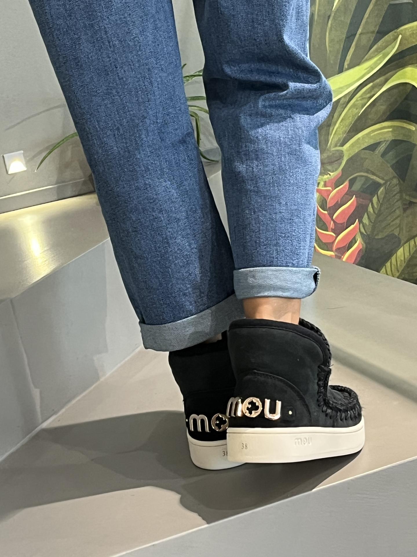 STIVALETTO IN CAMOSCIO E VERO MONTONE CON CUCITURE TIPICHE DEL NOTO MARCHIO. PLANTARE INTERNO ESTRAIBILE. LOGO IN METALLO SUL RETRO. TACCO 30, FONDO GOMMA SNEAKER.
