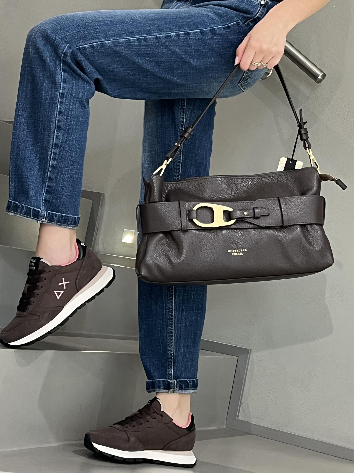 BORSA IN PELLE CON ZIP DI CHIUSURA. INTERNO FODERATO E CON TASCHE. TRACOLLA LUNGA IN PELLE INCLUSA. FASCIA DESIGN STACCABILE CHE SI PUò PORTARE A FUSCIACCA IN VITA (CINTURA). MISURE 37X19X11