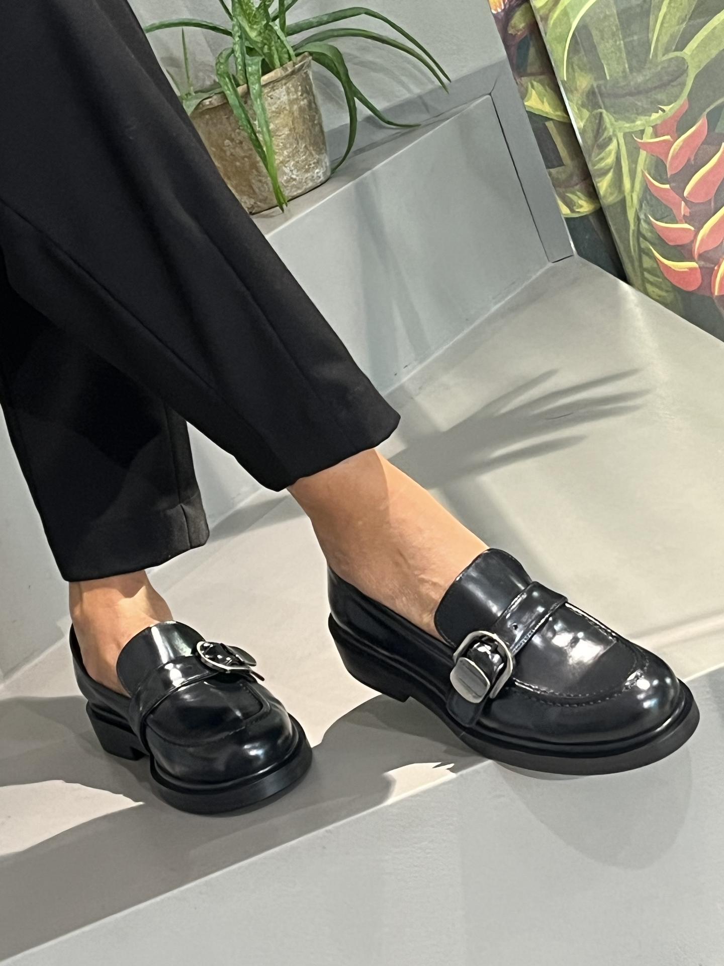 SCARPA IN PELLE SPAZZOLATA CON FIBBIA DESIGN FRONTALE. TACCO 35, FONDO GOMMA. MADE IN SPAIN
