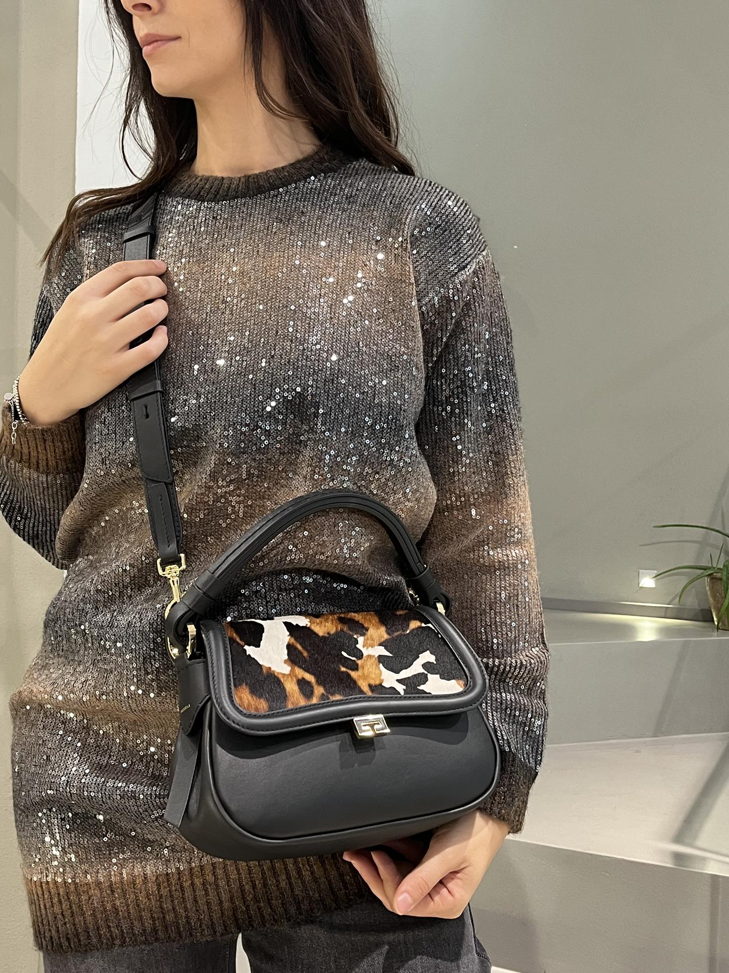BORSA IN PELLE E CAVALLINO ANIMALIER. PATTA E BOTTONE MAGNETICO DI CHIUSURA. INTERNO FODERATO E CON TASCHE. TRACOLLA LUNGA IN PELLE IN TINTA. MISURE 25X17X9. MADE IN ITALY