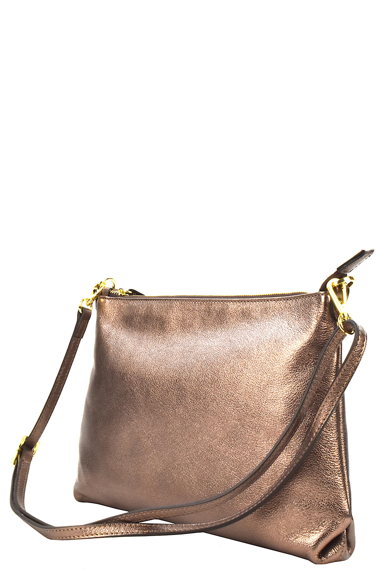 BORSA IN PELLE LAMINATA CON ZIP DI CHIUSURA. INTERNO FODERATO E CON TASCHE. MANICOTTO IN PELLE E TRACOLLA IN PELLE IN TINTA REGOLABILE. MISURE 29X19X4