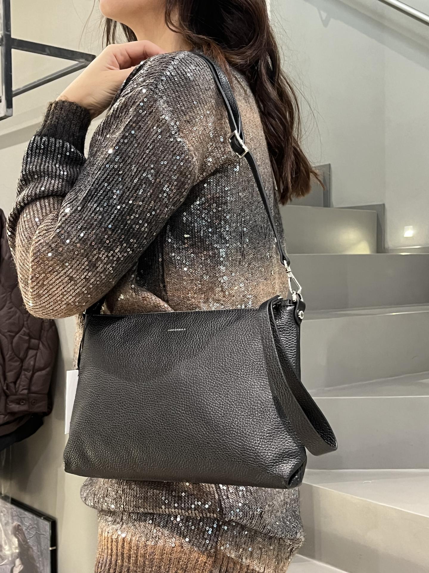 BORSA IN PELLE CON ZIP DI CHIUSURA. INTERNO FODERATO E CON TASCHE. MANICOTTO IN PELLE E TRACOLLA IN PELLE IN TINTA REGOLABILE. MISURE 29X19X4