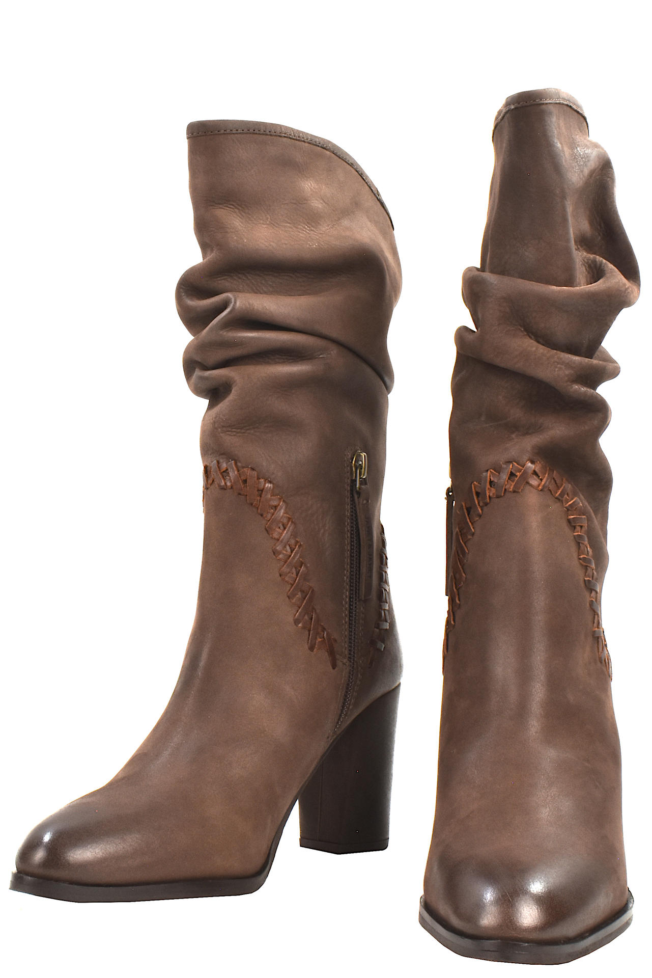 STIVALE IN PELLE CON ARRICCIATURA PREFORMATA E ZIP CORTA SU LATO INTERNO. MISURA DEL GAMBALE (DAL TALLONE COMPRESO IN SU) 280. TACCO 85, FONDO GOMMA.