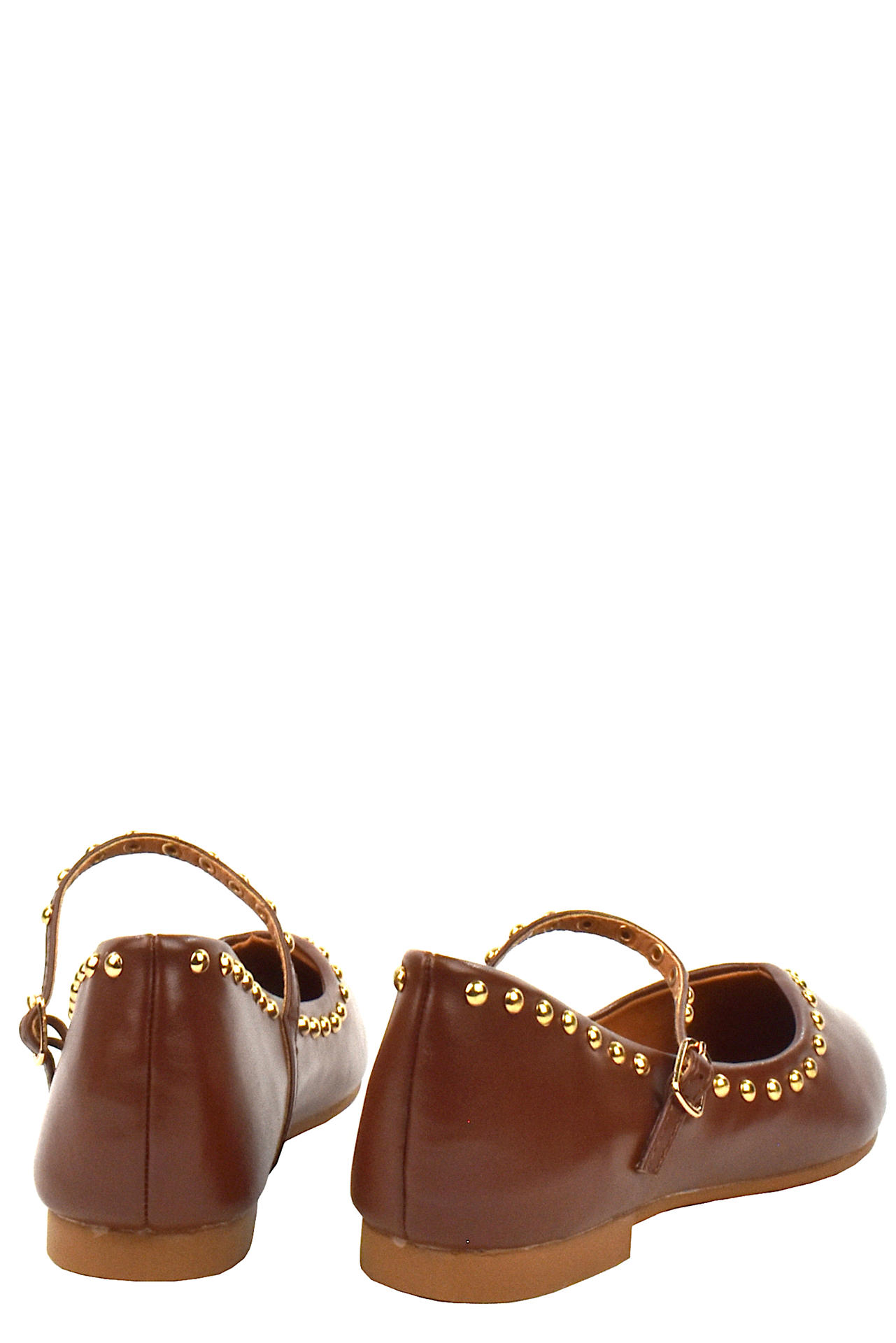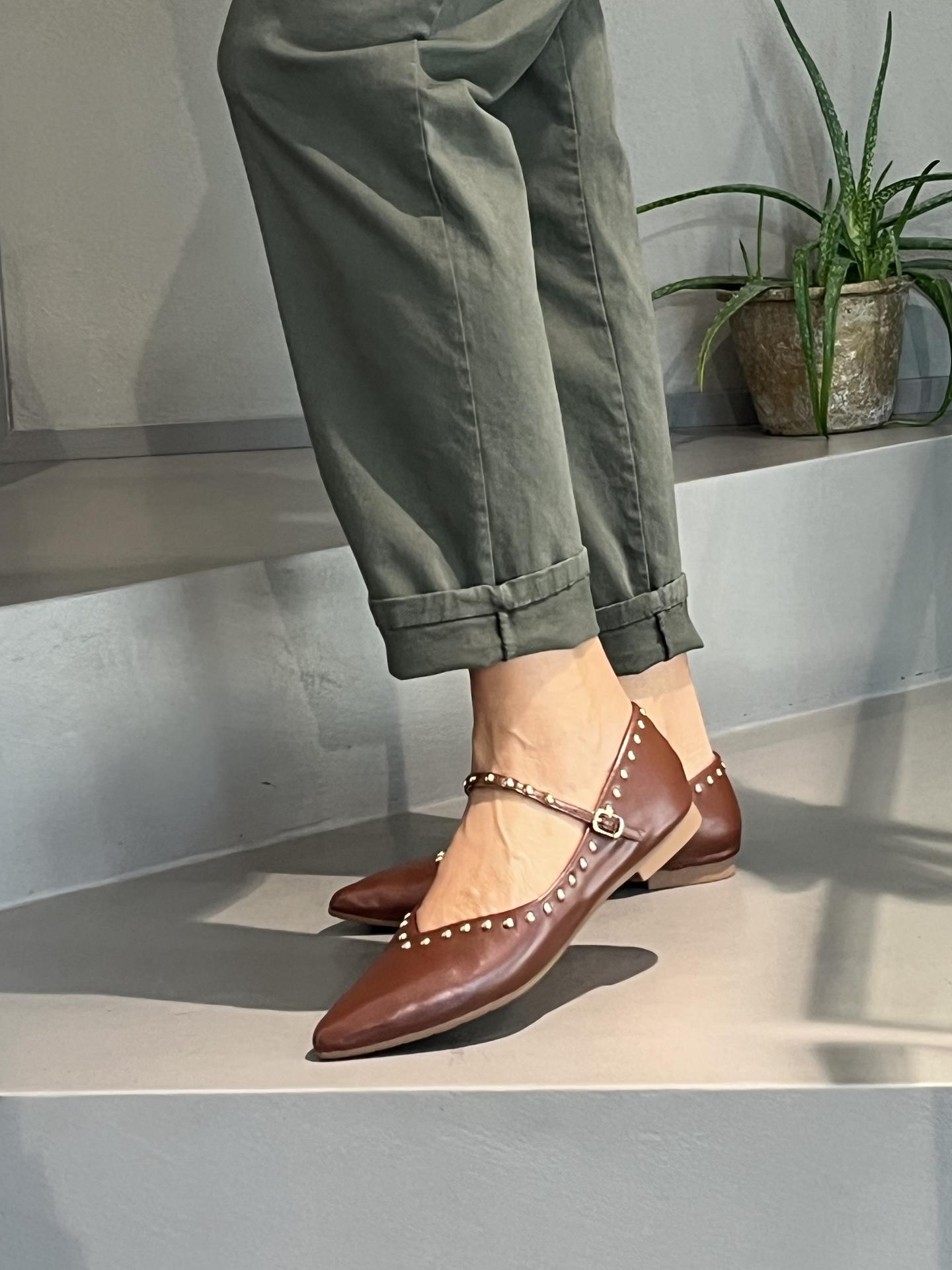 SCARPA IN PELLE CON APPLICAZIONE DI BORCHIETTE. CINTURINO REGOLABILE. COSTRUZIONE A SACCHETTO SUPER FLESSIBILE. TACCO 10, FONDO GOMMA.