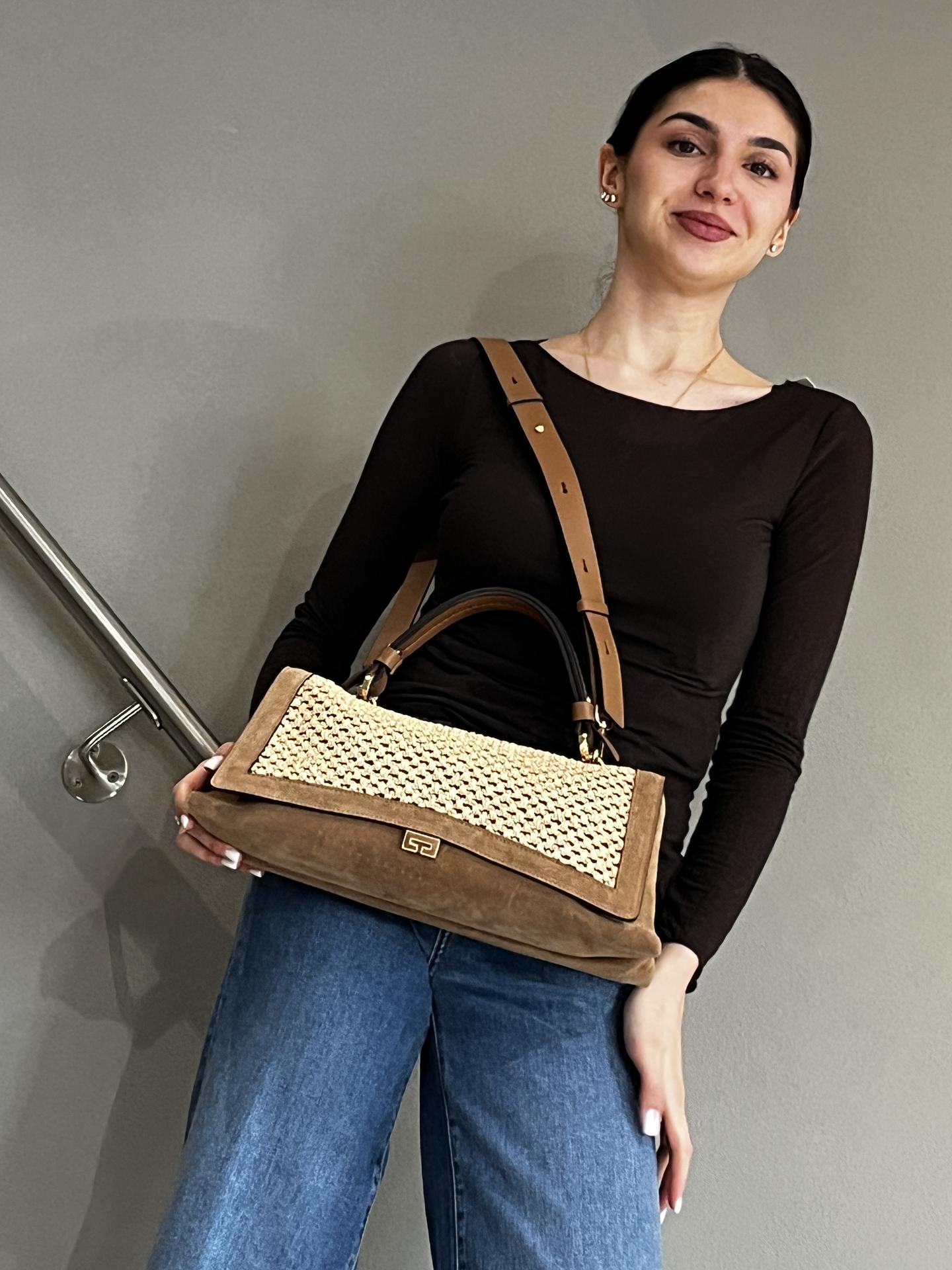 BORSA IN CAMOSCIO, PELLE E RAFFIA LAVORATA. PATTA CON ZIP INTERNA DI CHIUSURA. INTERNO FODERATO E CON TASCHE. TRACOLLA IN PELLE IN TINTA INCLUSA. MISURE 36X15X11. MADE IN ITALY