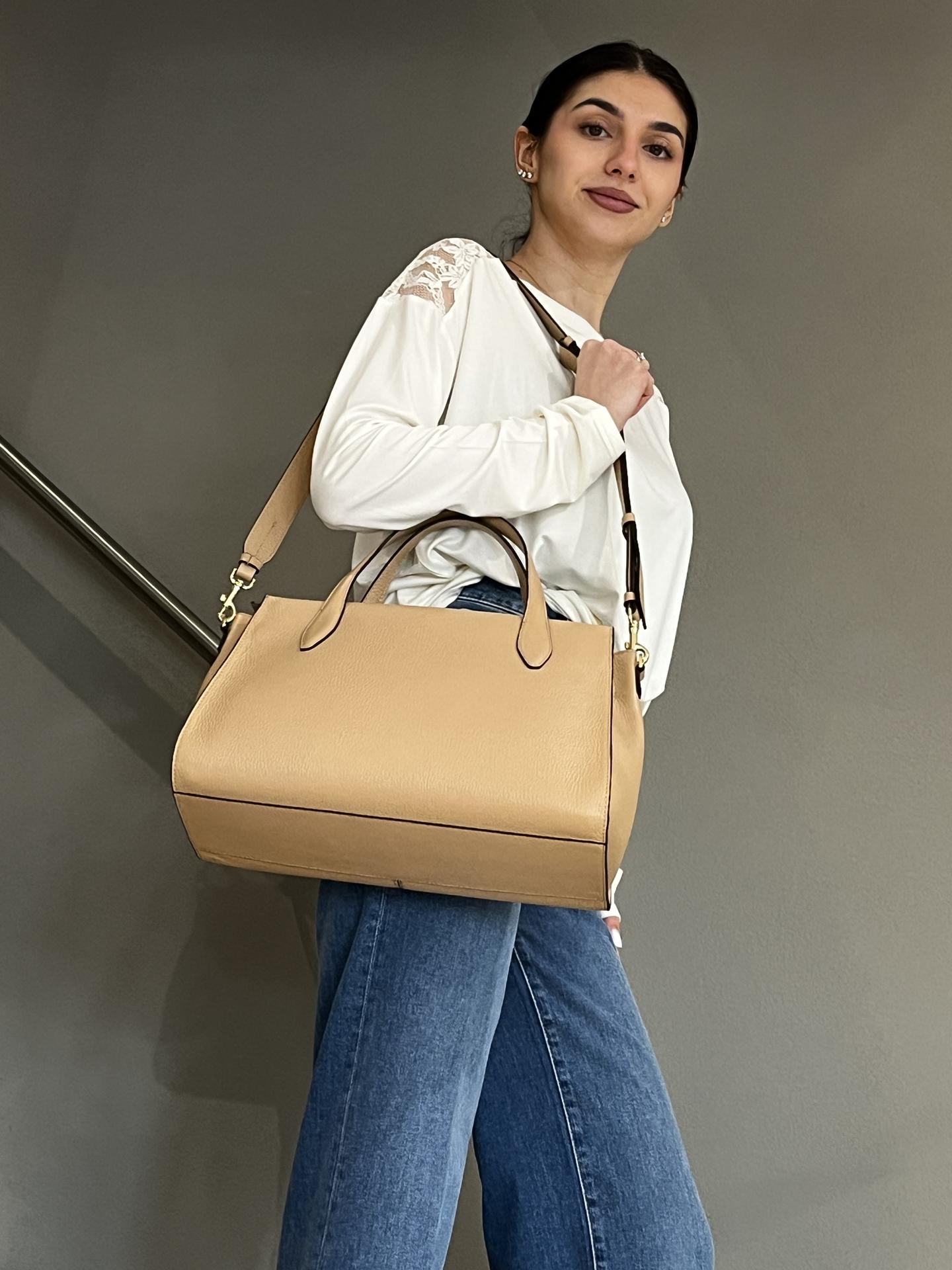 BORSA IN PELLE CON ZIP DI CHIUSURA. INTERNO FODERATO E CON TASCHE. TRACOLLA IN PELLE IN TINTA INCLUSA. MISURE 35X21,5X15,5. MADE IN ITALY