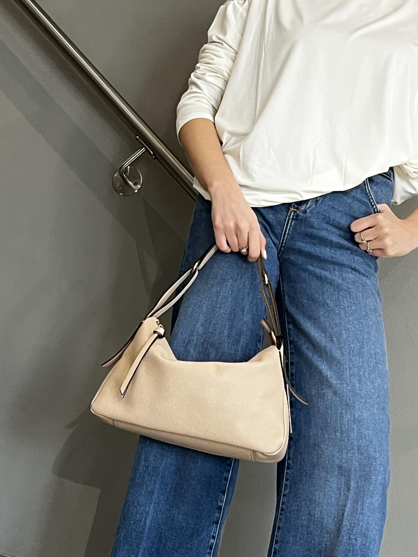 BORSA IN PELLE CON ZIP DI CHIUSURA. INTERNO FODERATO E CON TASCHE. TRACOLLA IN PELLE IN TINTA INCLUSA. MISURE 30X17X10. MADE IN ITALY