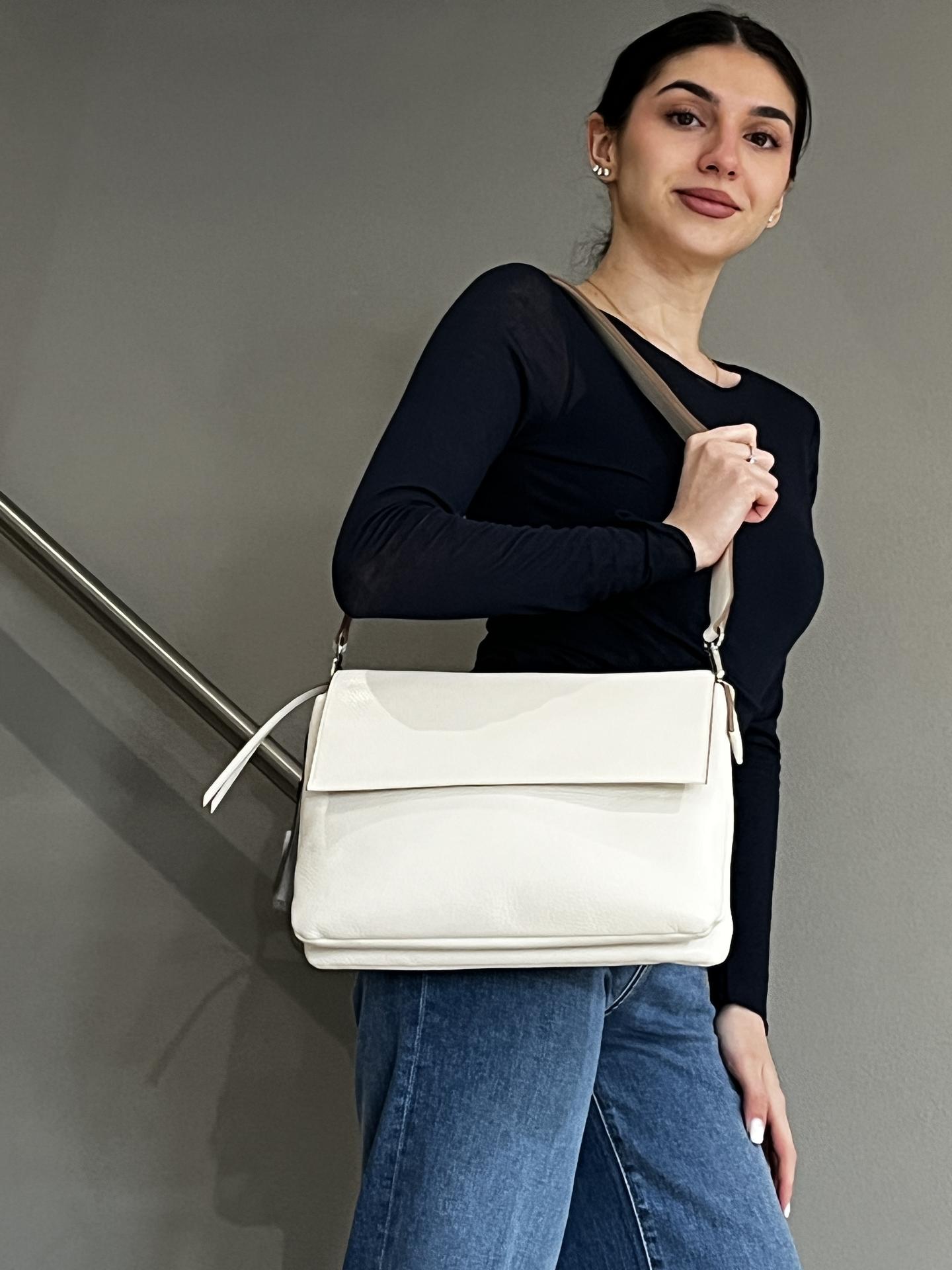 BORSA "THREE" IN PELLE CON PATTA E BOTTONE MAGNETICO DI CHIUSURA. TASCA CON ZIP DI CHIUSURA, INTERNO SUDDIVISO IN DUE AMPIE TASCHE E FODERATO. TASCA FRONTALE CON ZIP. TRACOLLA IN PELLE IN TINTA REGOLABILE. MISURE 31X23X6