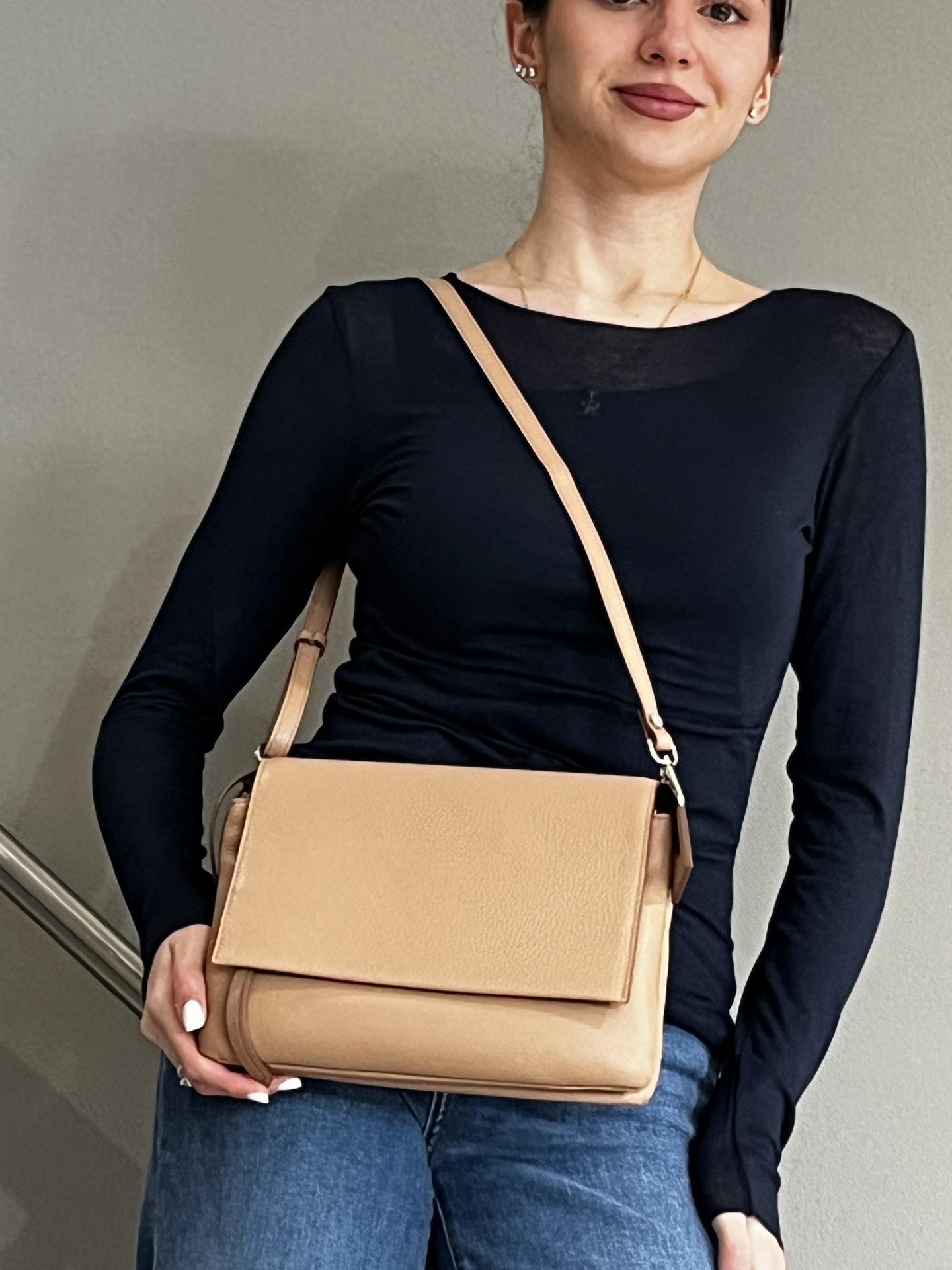 BORSA IN PELLE CON PATTA E BOTTONE MAGNETICO DI CHIUSURA. ZIP DI CHUSURA ED INTERNO SUDDIVISO IN DUE AMPIE TASCHE. INTERNO FODERATO. TASCA FRONTALE CON ZIP. TRACOLLA IN PELLE REGOLABILE. MISURE 25,5X20X6
