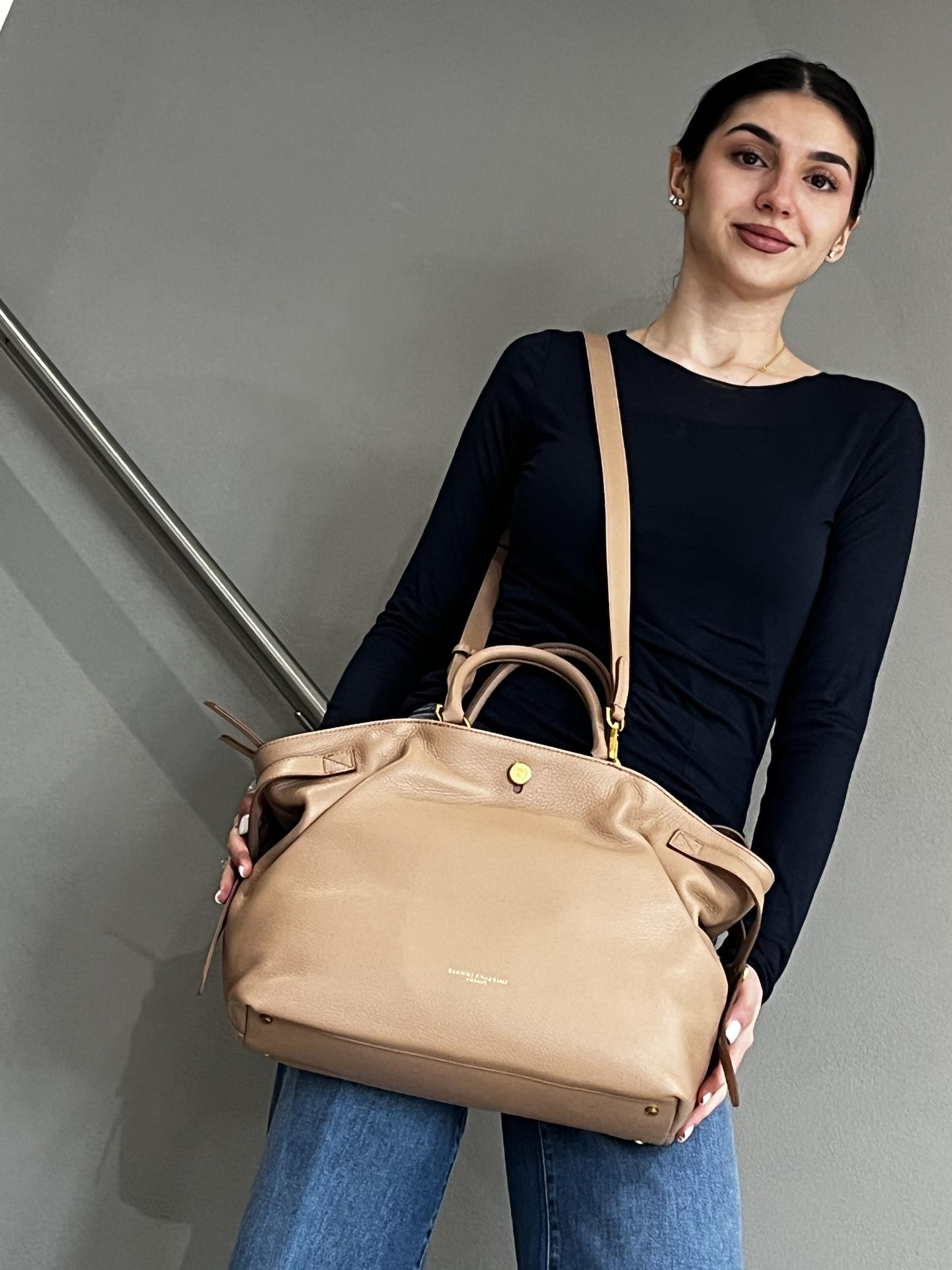 BORSA "CLAUDETTE" IN PELLE CON AMPIA TASCA CON ZIP A DOPPIA MANDATA DI CHIUSURA. INTERNO FODERATO E CON TASCHE. TRACOLLA IN PELLE IN TINTA. MISURE 32X26X14,5
