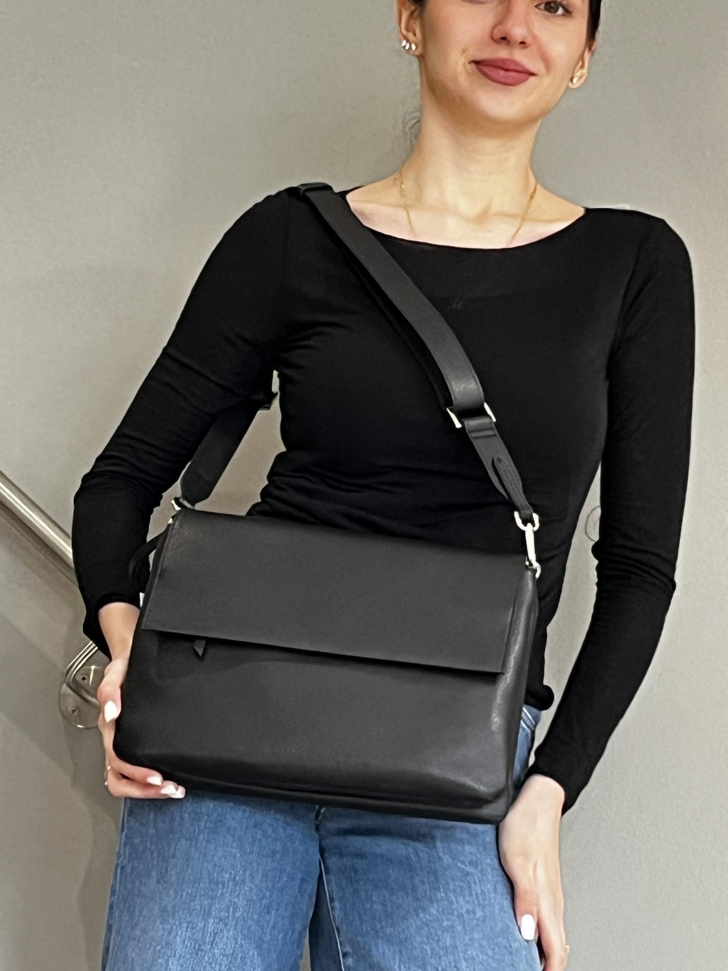 BORSA "THREE" IN PELLE CON PATTA E BOTTONE MAGNETICO DI CHIUSURA. TASCA CON ZIP DI CHIUSURA, INTERNO SUDDIVISO IN DUE AMPIE TASCHE E FODERATO. TASCA FRONTALE CON ZIP. TRACOLLA IN PELLE IN TINTA REGOLABILE. MISURE 31X23X6