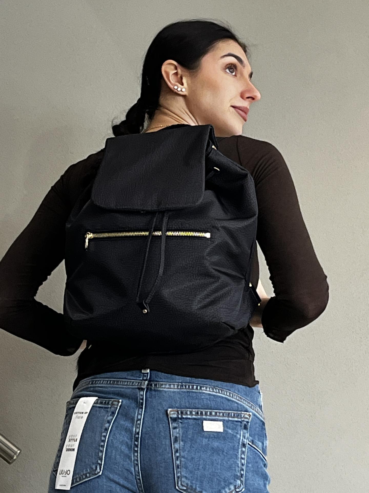 ZAINO BEST SELLER IN TESSUTO STAMPATO TAPIRO CON PATTA, COULISSE E BOTTONE MAGNETICO DI CHIUSURA. MANICI REGOLABILI. TASCA FRONTALE CON ZIP. INTERNO FODERATO E CON TASCHE. MISURE 28X26X29