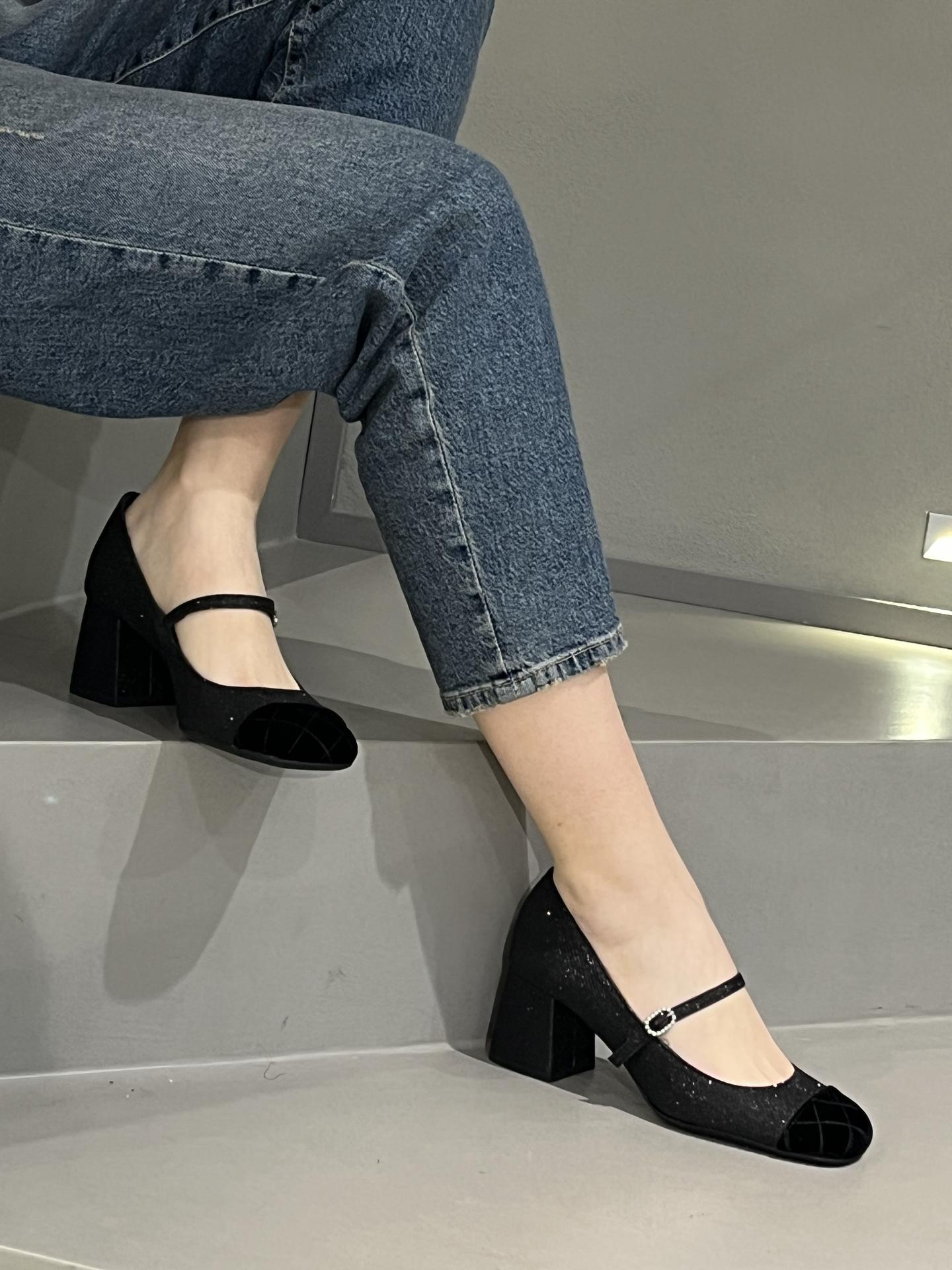 SCARPA IN TESSUTO GLITTERATO E VELLUTO LAVORATO SUL PUNTALE. INTERNO CON FODERA IN PELLE. CINTURINO CON FIBBIETTA DI MICRO PERLINE. TACCO 60, FONDO GOMMA. MADE IN ITALY
