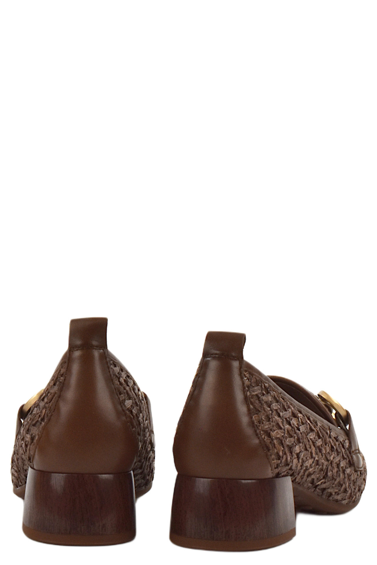 SCARPA IN TESSUTO LAVORATO E RIFINITURE IN PELLE. TACCO 35, FONDO GOMMA.