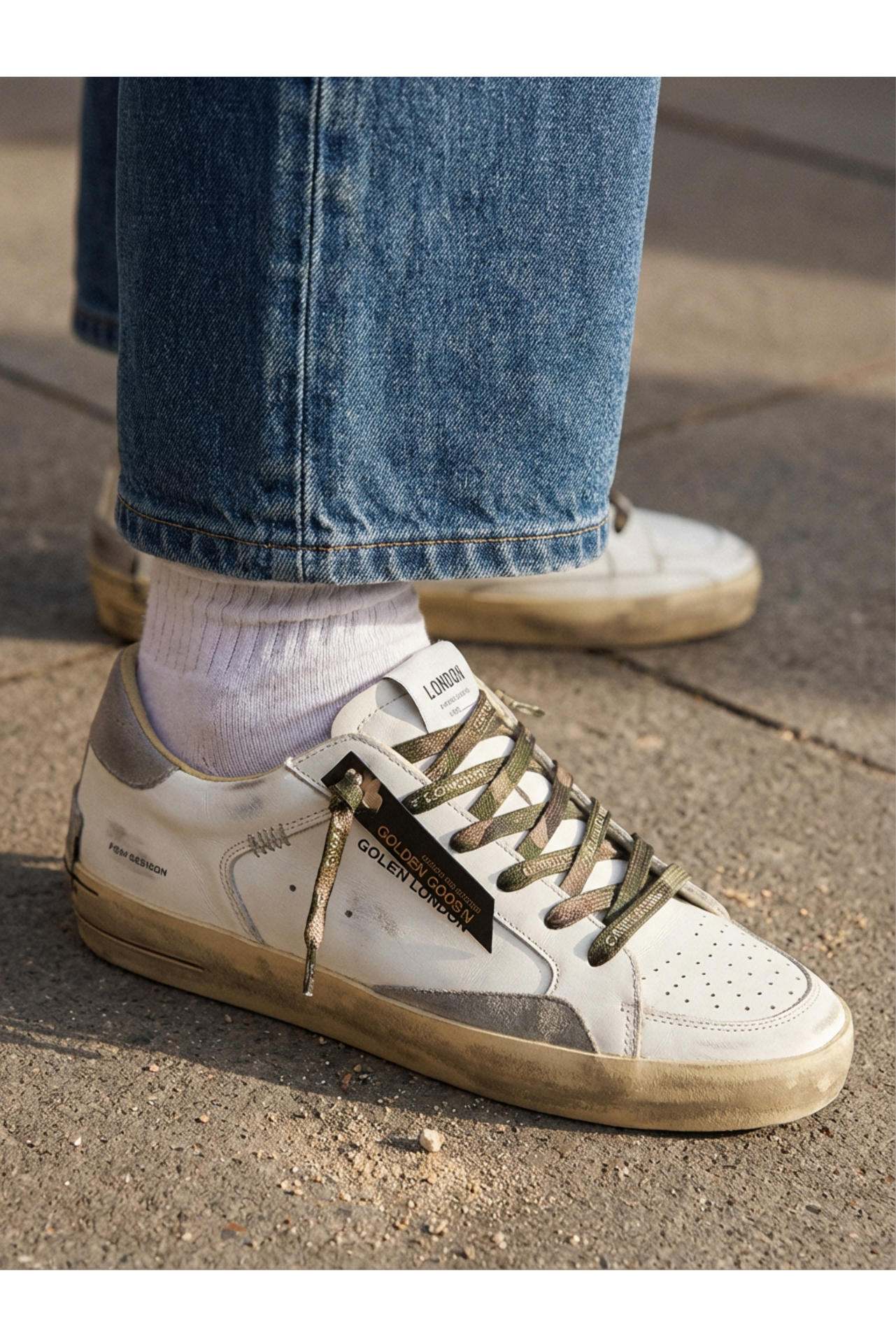 SNEAKER STRINGATA IN PELLE E CAMOSCIO CON FORI "RETRO BASKET" NELLA VASCHETTA FRONTALE. PLANTARE INTERNO ESTRAIBILE. TACCO 30, FONDO GOMMA.