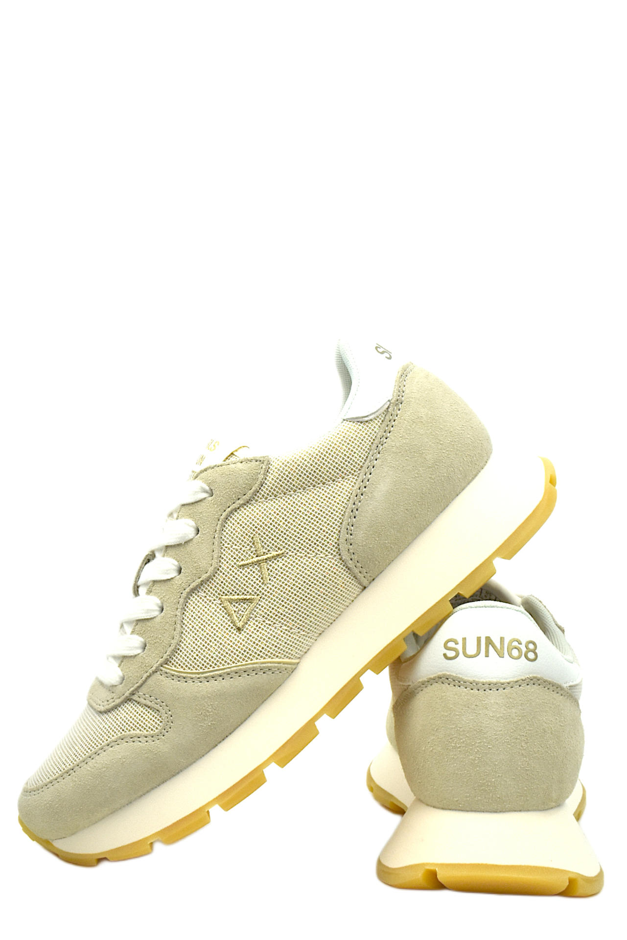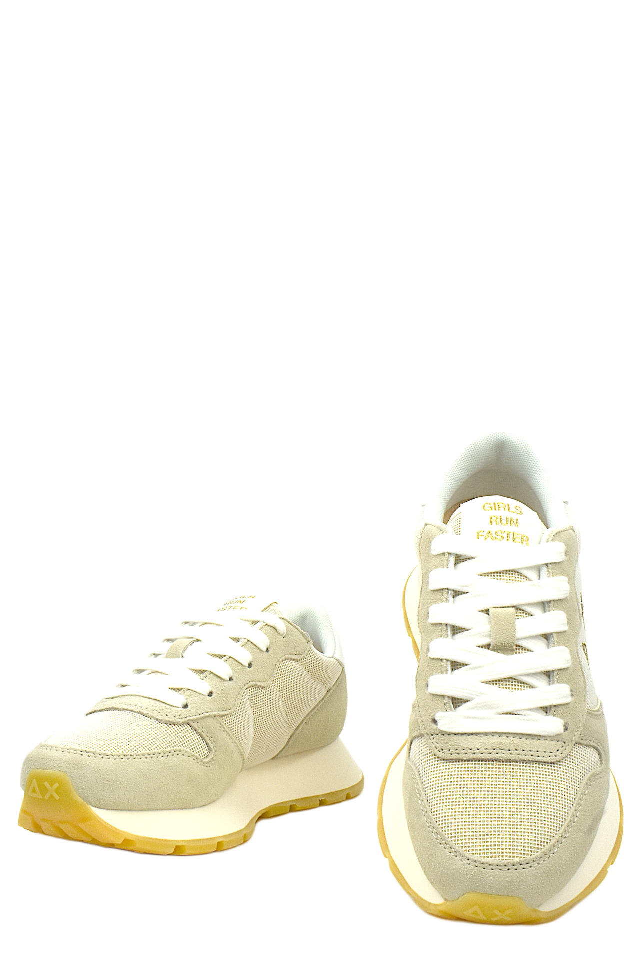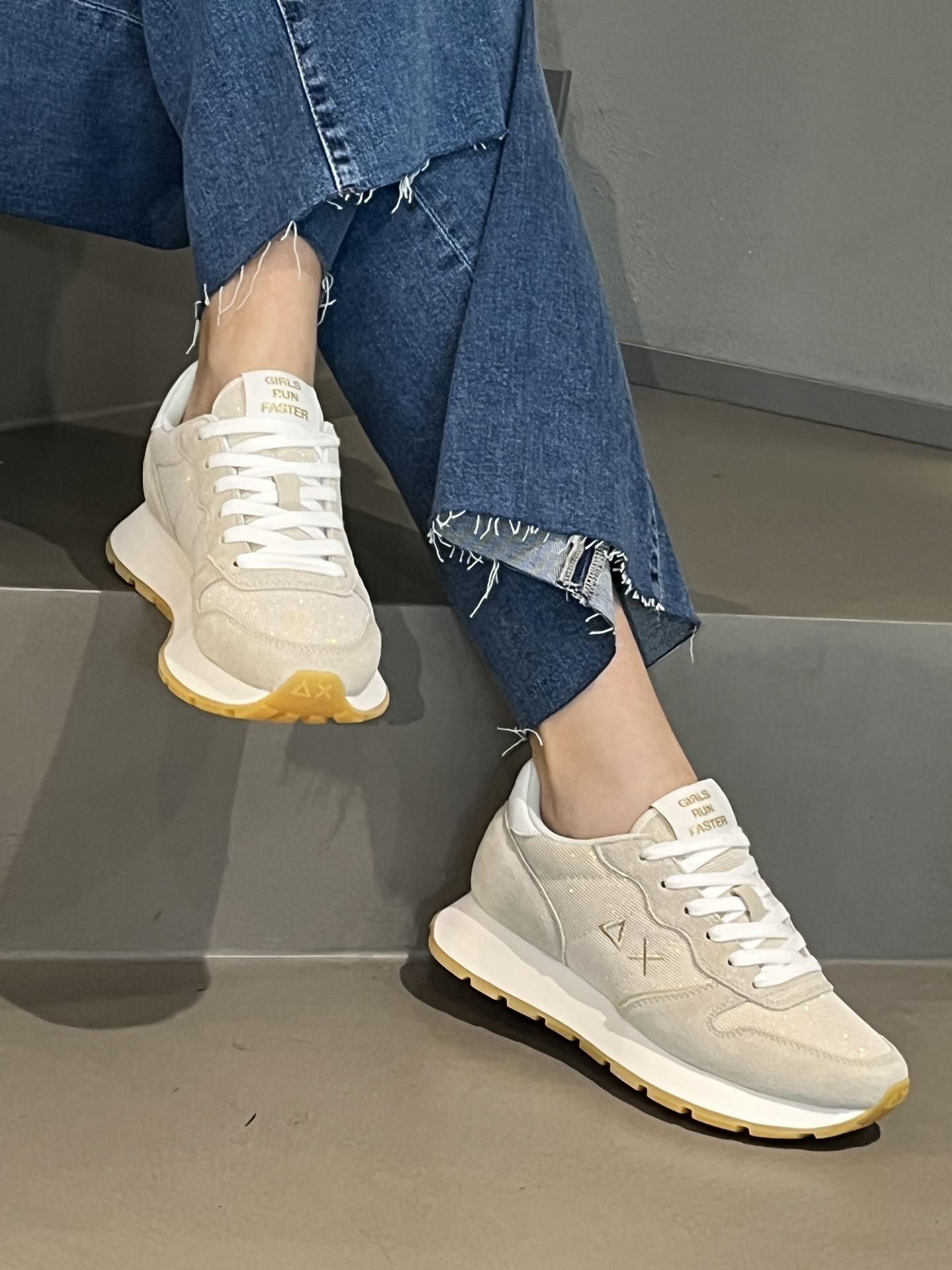 SNEAKER STRINGATA IN CAMOSCIO E TESSUTO TECNICO GLITTERATO. PLANTARE INTERNO ESTRAIBILE. TACCO 35, FONDO GOMMA.