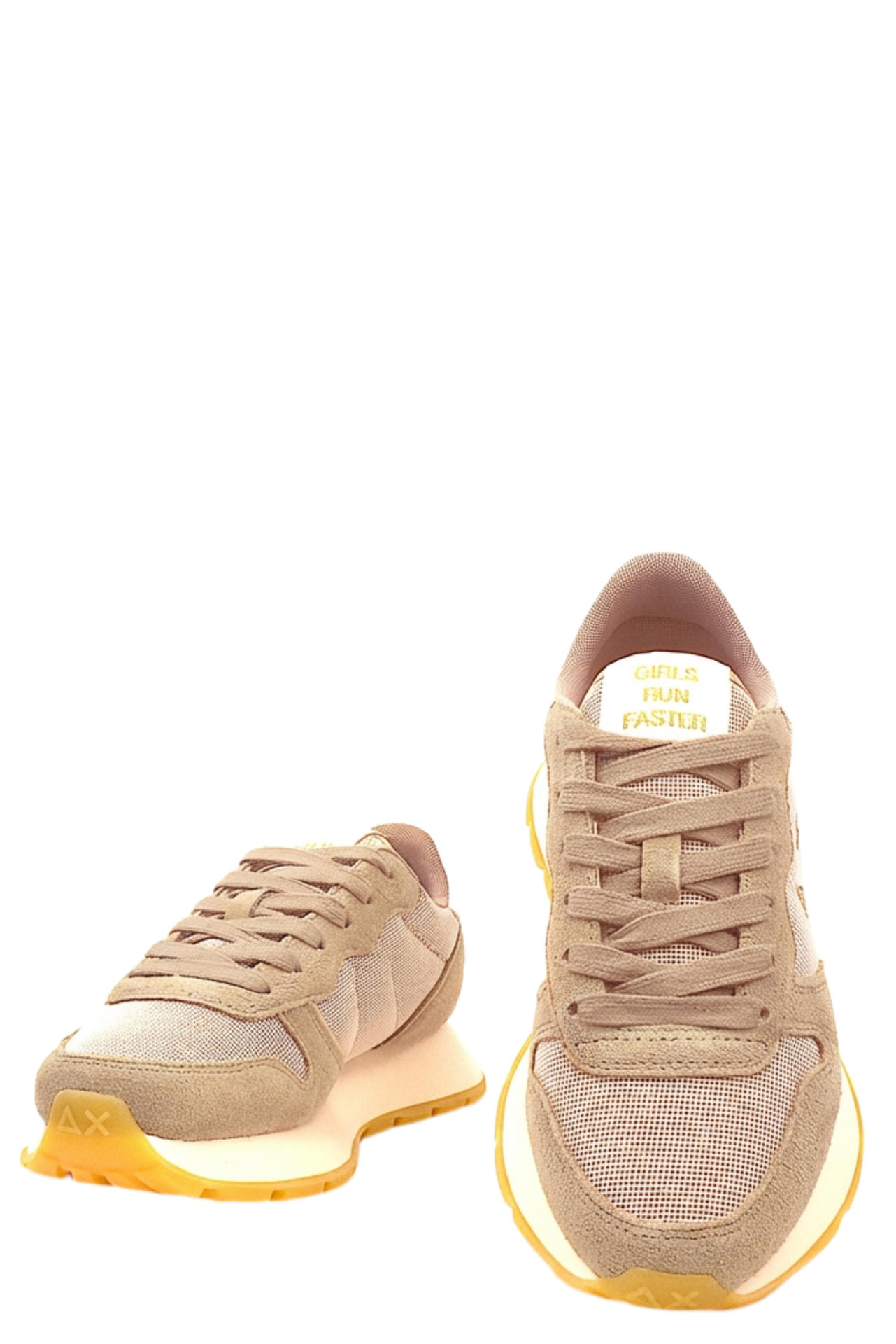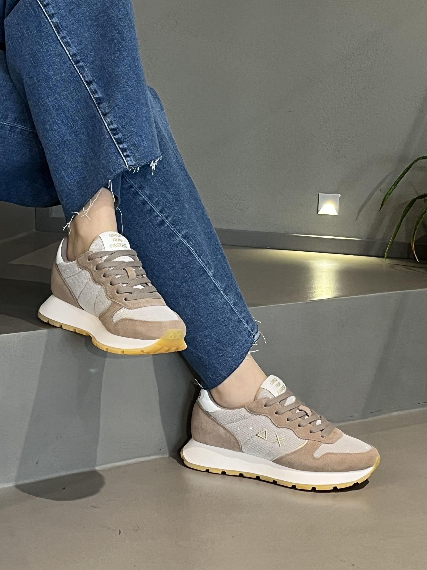 SNEAKER STRINGATA IN CAMOSCIO E TESSUTO TECNICO GLITTERATO. PLANTARE INTERNO ESTRAIBILE. TACCO 35, FONDO GOMMA.
