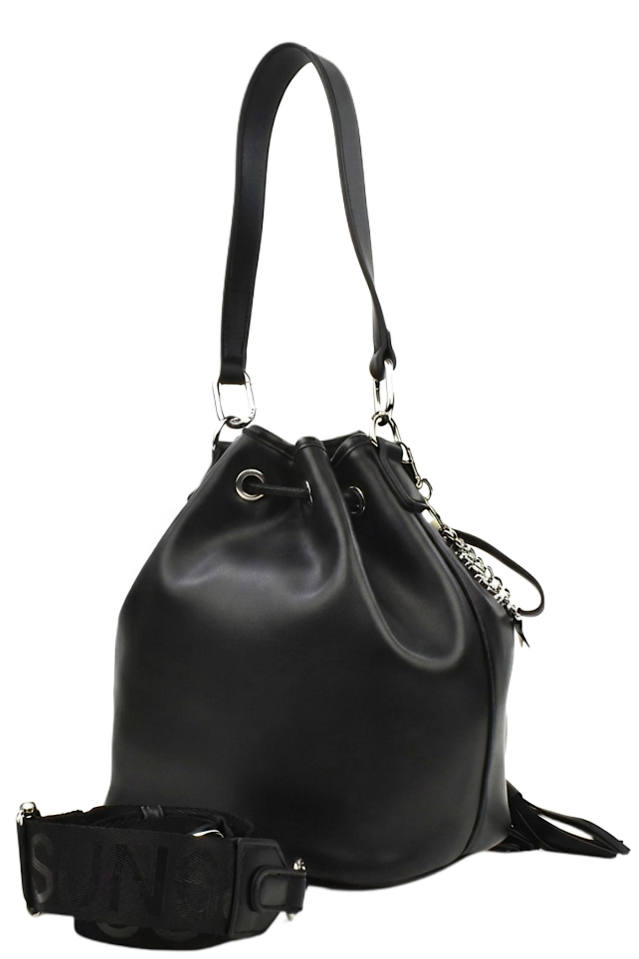 BORSA IN SIMIL PELLE CON COULISSE DI CHIUSURA. INTERNO FODERATO E CON TASCHE. TRACOLLA LUNGA IN TESSUTO LOGATO REGOLABILE E STACCABILE INCLUSA. CHARMS STACCABILE. MISURE 21X25X16
