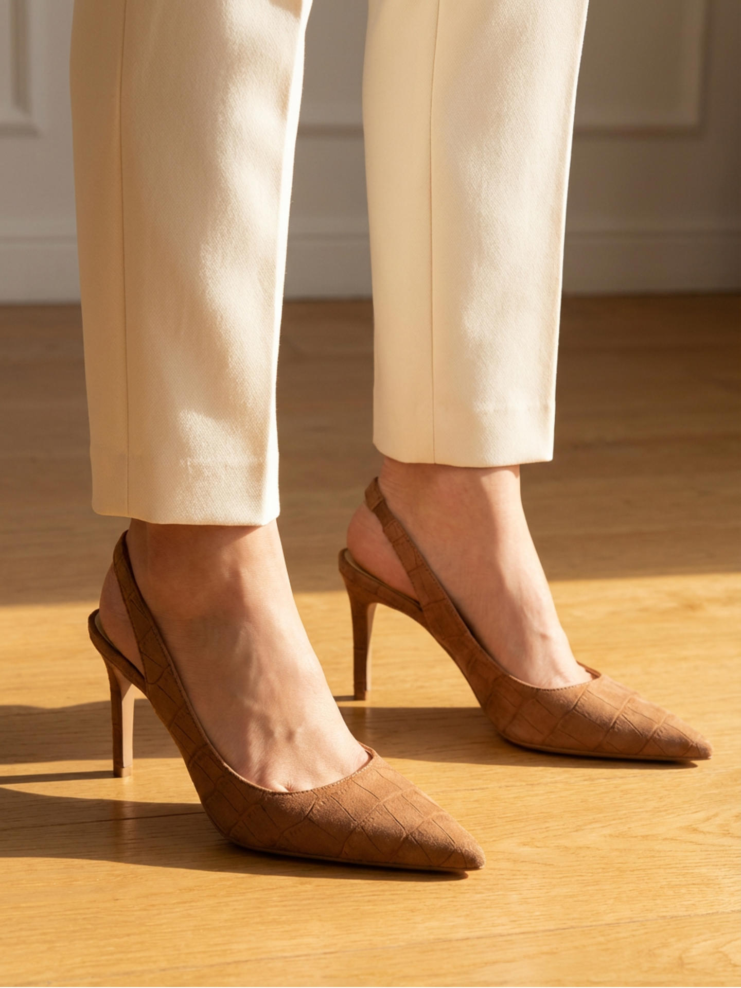 CHANEL IN CAMOSCIO STAMPATO EFFETTO COCCO. PICCOLO INSERTO ELASTICO SU LATO INTERNO POSTERIORE PER UNA PERFETTA CALZATA. TACCO 80, FONDO GOMMA.