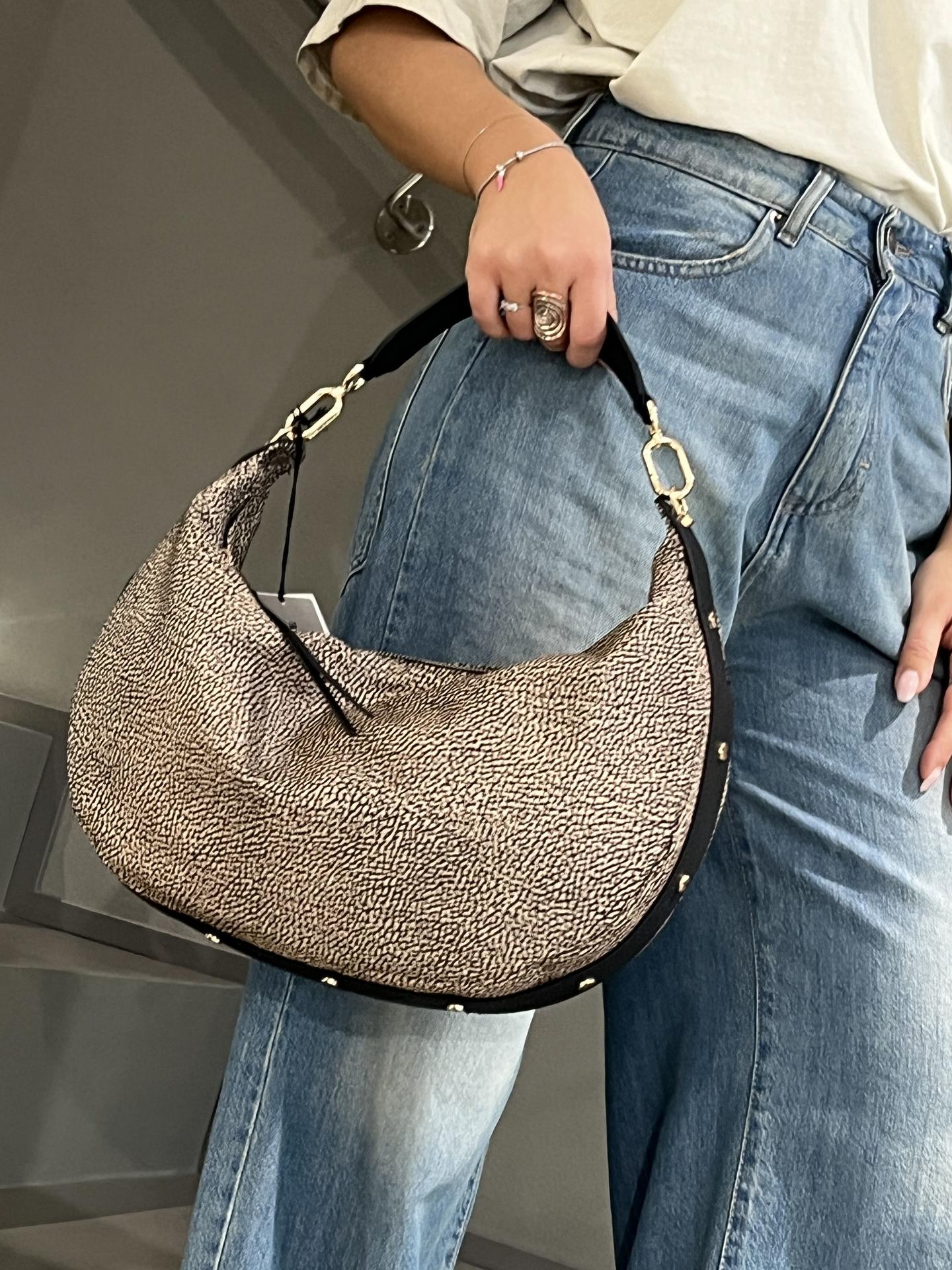 BORSA HOBO IN TESSUTO TECNICO STAMPATO EFFETTO TAPIRO CON ZIP DI CHIUSURA. TRACOLLA IN PELLE. INTERNO FODERATO E CON TASCHE. MISURE 40X20X10