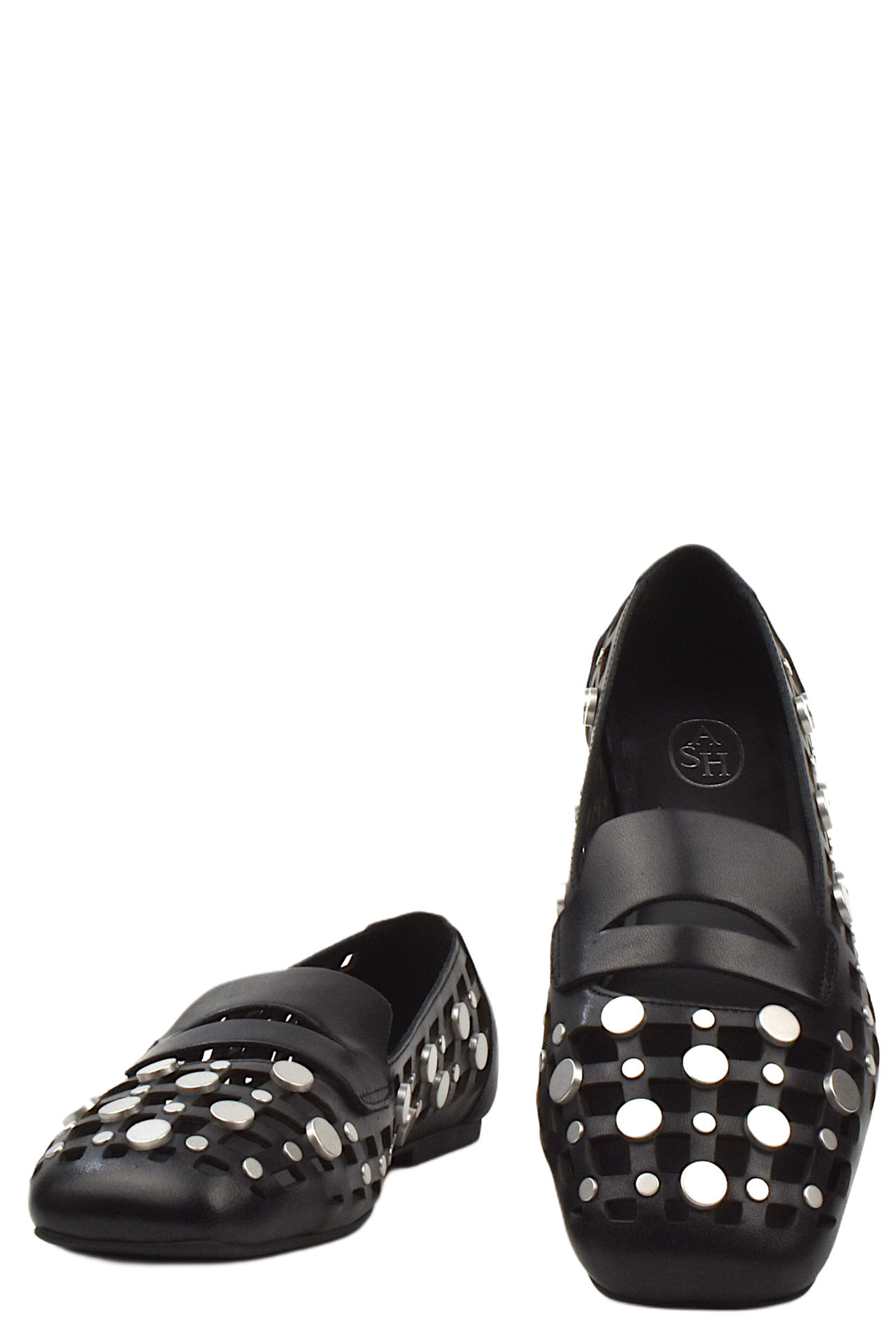 SCARPA IN PELLE DESIGN CON APERTURE E APPLICAZIONE DI BORCHIE PIATTE. MORBIDO SOTTOPIEDE IN PELLE. TACCO 10, FONDO GOMMA.