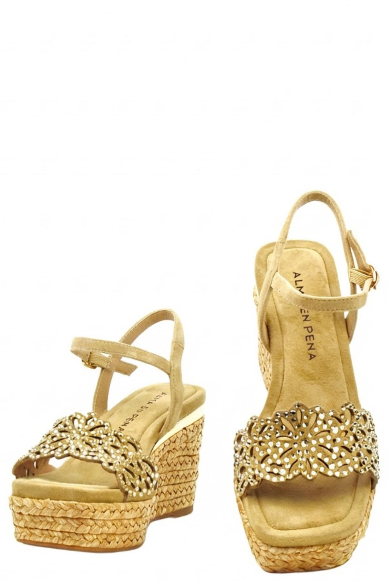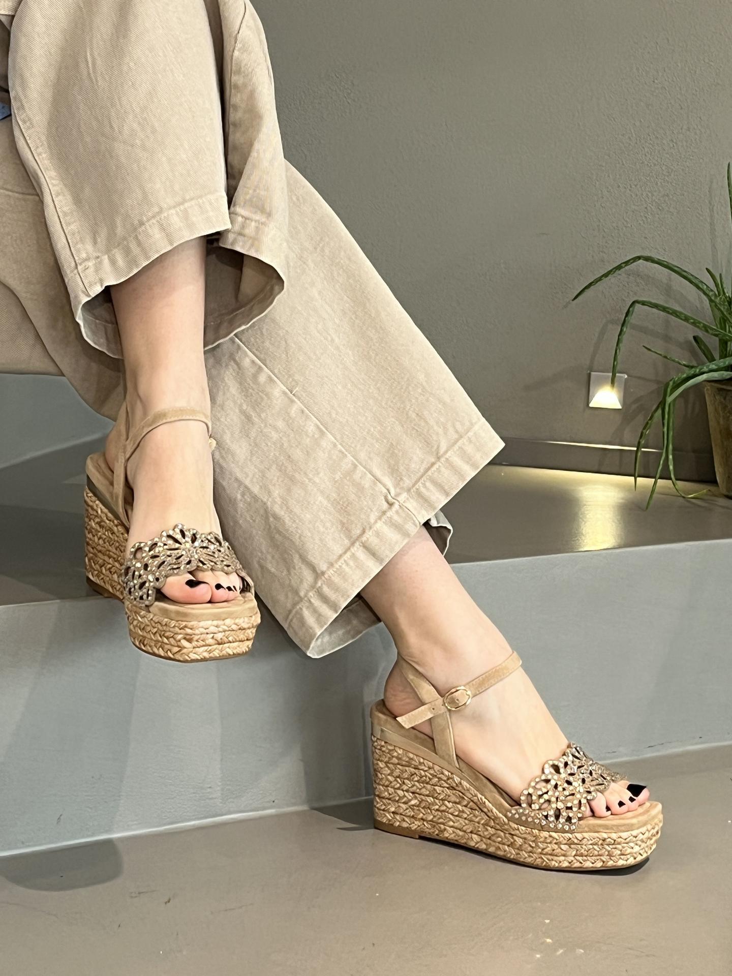 SANDALO IN CAMOSCIO CON APPLICAZIONE DI STRASS E CINTURINO ALLA CAVIGLIA. MORBIDO SOTTOPIEDE. ZEPPA IN RAFFIA INTRECCIATA. TACCO 90, PLATFORM 35, FONDO GOMMA.