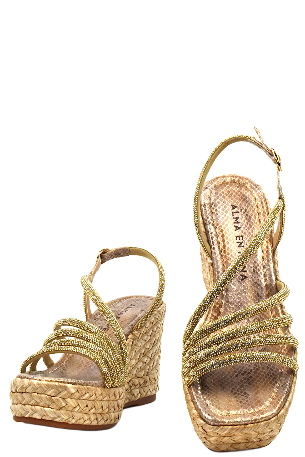 SANDALO IN ECO PELLE STAMPATA EFFETTO RETTILE E APPLICAZIONE DI STRASS. CINTURINO REGOLABILE PER UNA PERFETTA AVVOLGENZA. MORBIDO SOTTOPIEDE. ZEPPA IN RAFFIA INTRECCIATA. TACCO 90, PLATFORM 35, FONDO GOMMA.