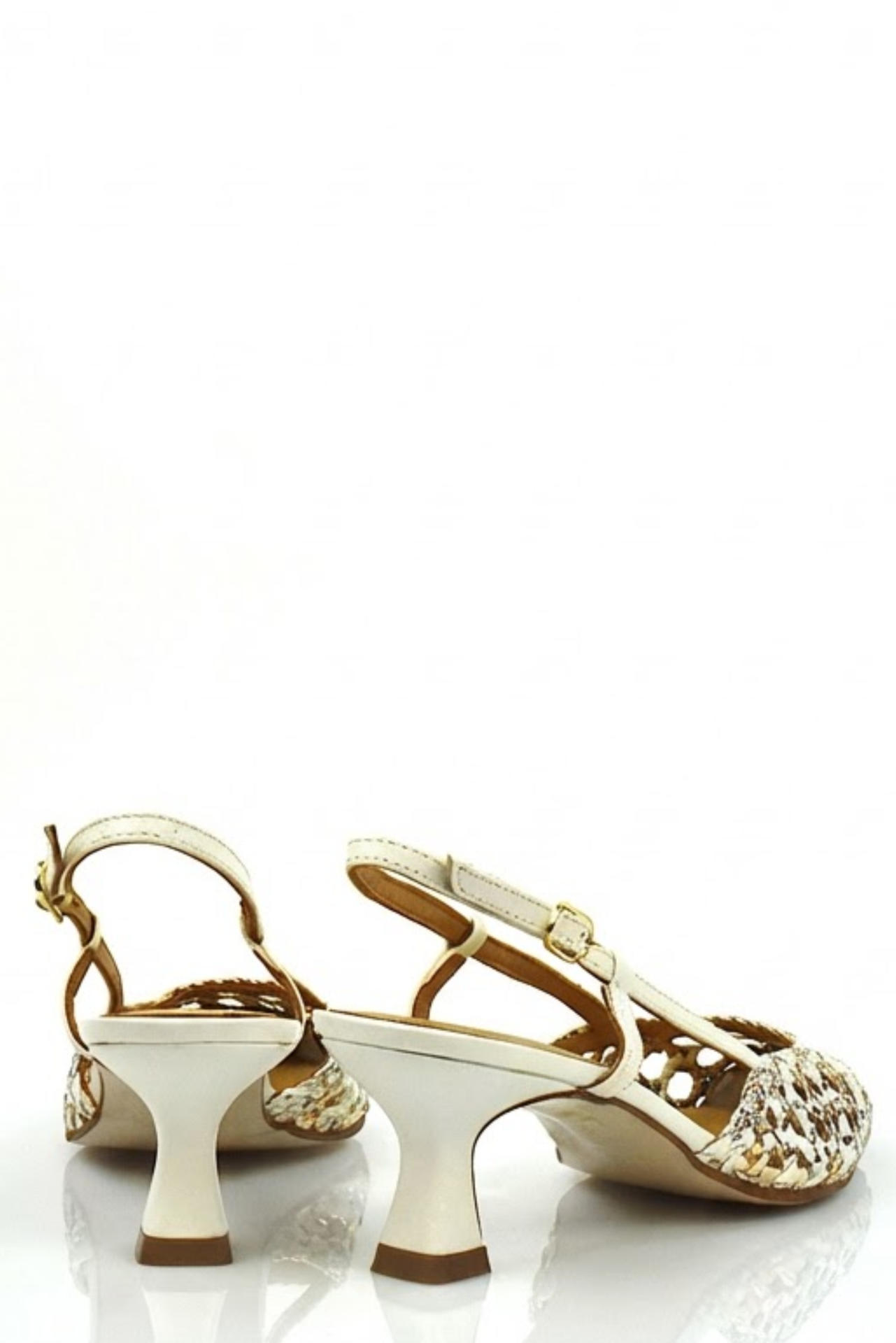 CHANEL IN PELLE E SIMIL PELLE INTRECCIATA CON CINTURINO SU LATO ESTERNO POSTERIORE. TACCO 55, FONDO GOMMA.