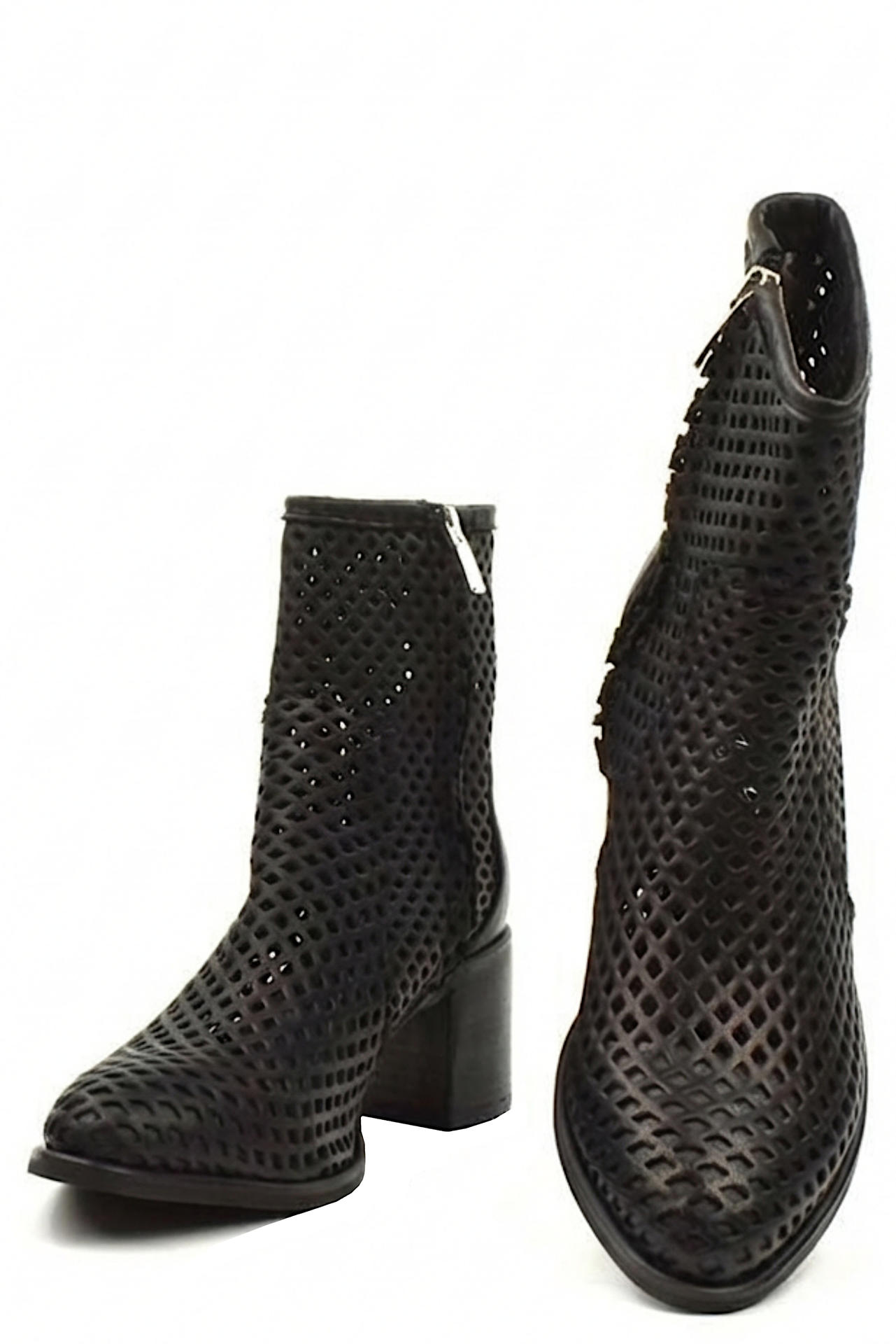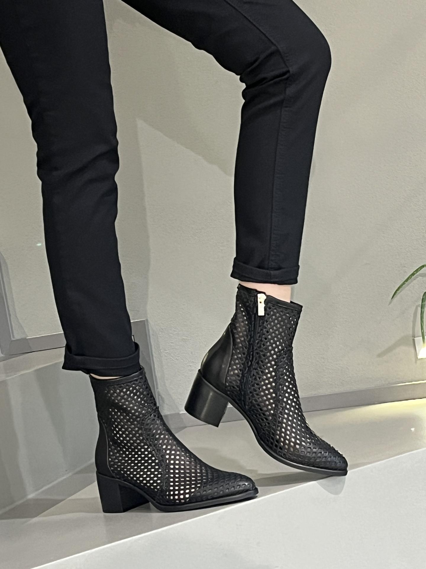 STIVALETTO IN PELLE TRAFORATA CON ZIP SU LATO INTERNO E FODERA RINFORZATA AGLI ESTREMI (PUNTA E TALLONE). TACCO 60, FONDO GOMMA. MADE IN ITALY