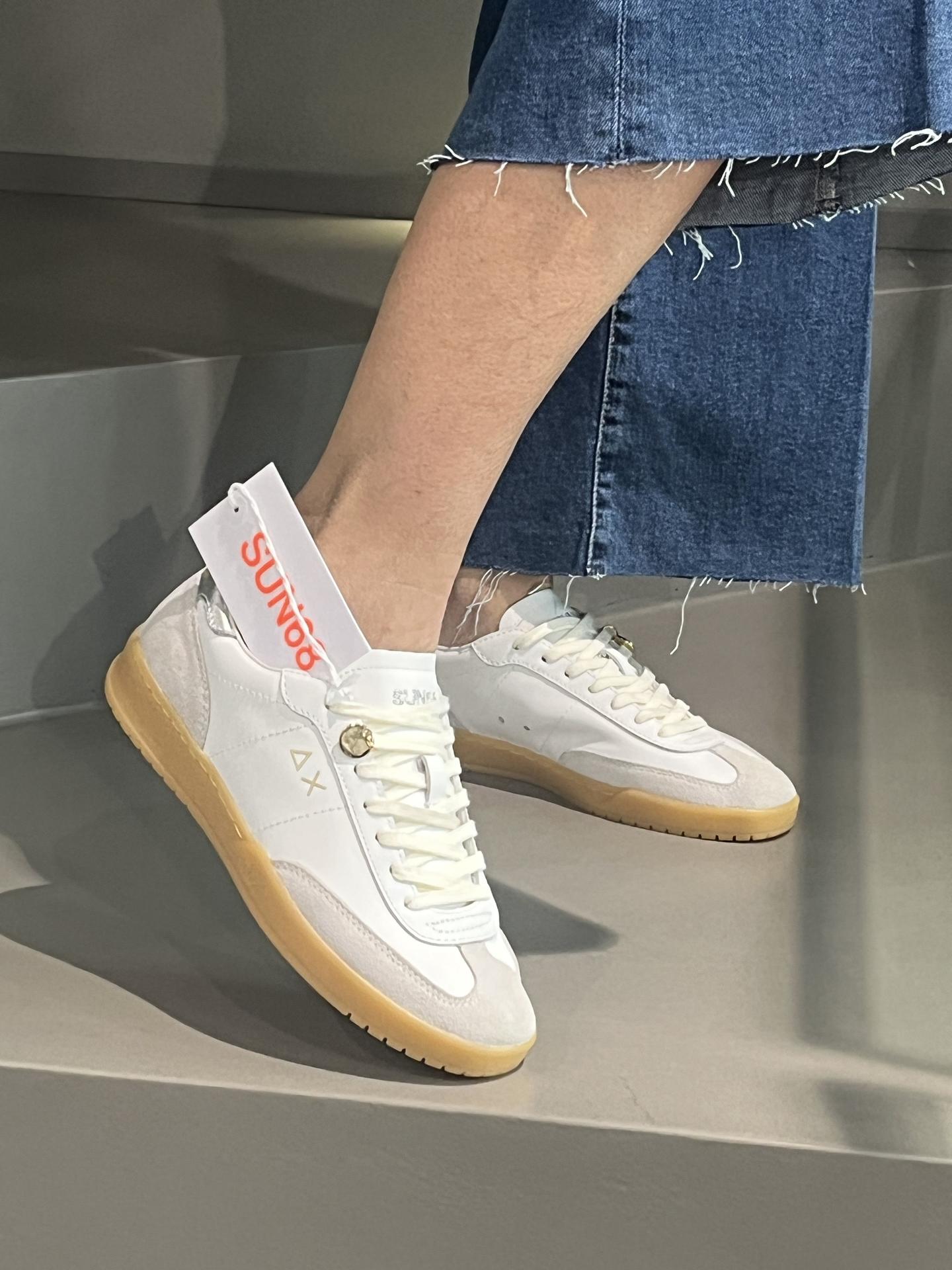 SNEAKER STRINGATA IN PELLE E CAMOSCIO. PLANTARE INTERNO ESTRAIBILE. TACCO 25, FONDO GOMMA.