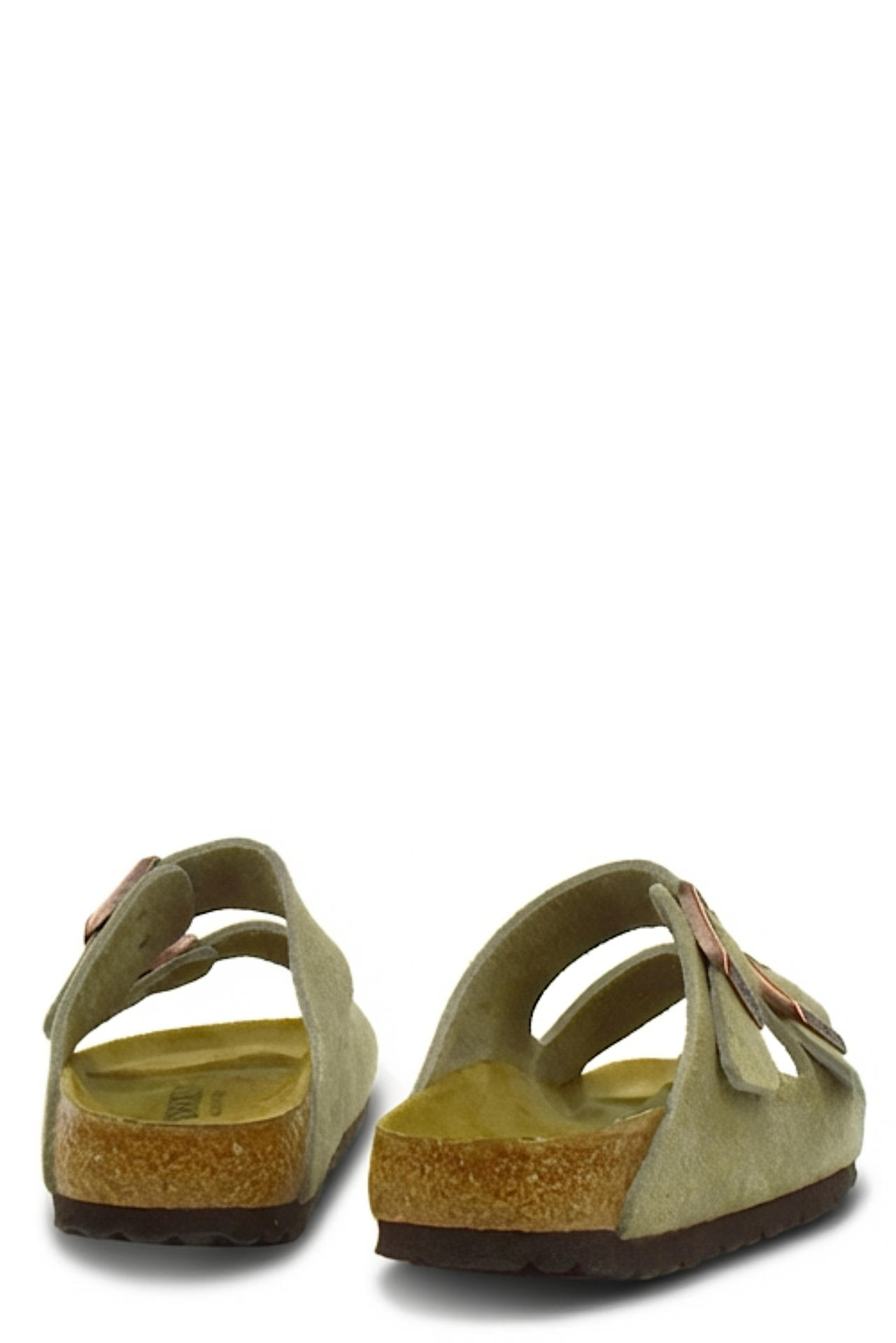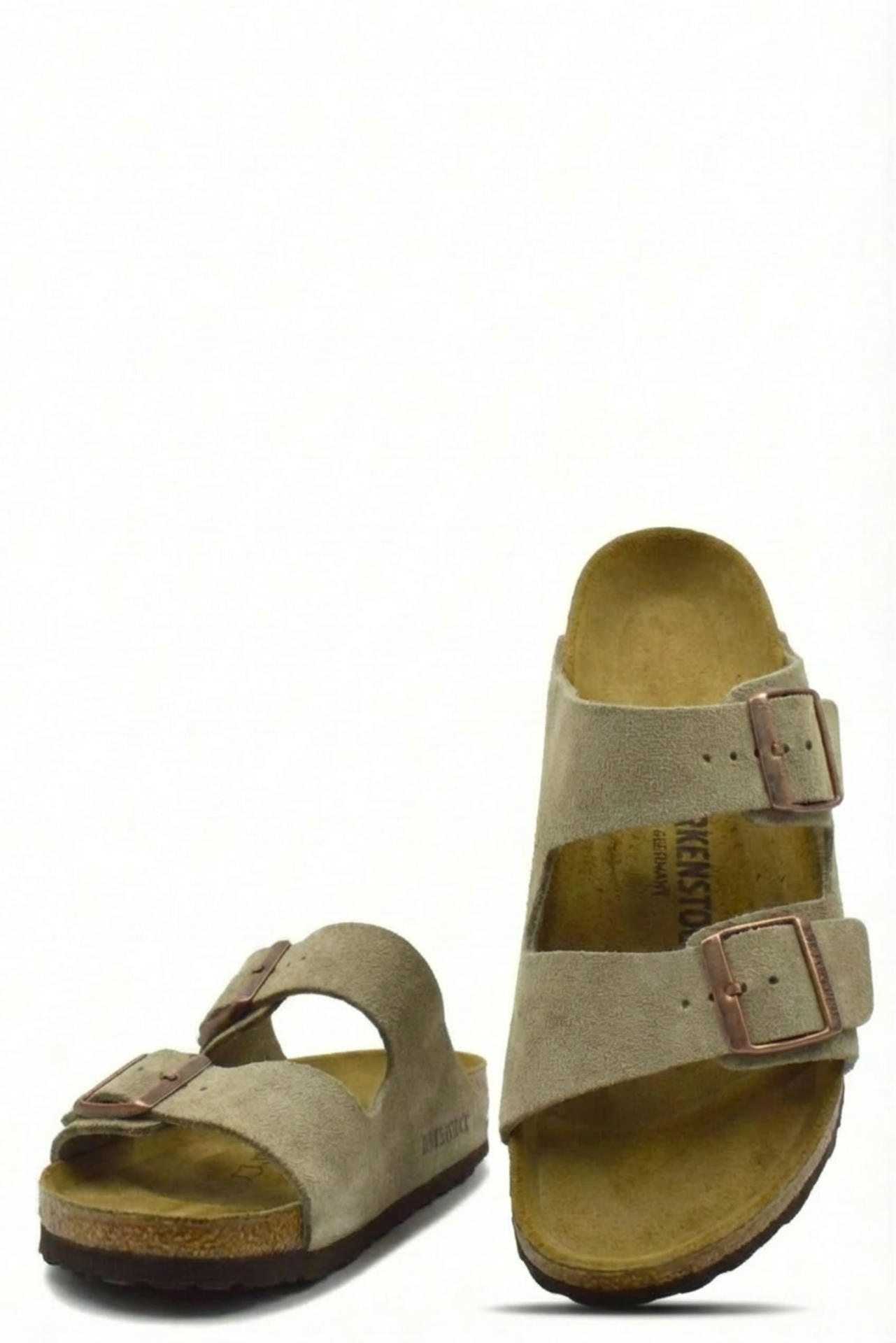 CIABATTINA ARIZONA IN CAMOSCIO CON FIBBIE REGOLABILI. SOTTOPIEDE INTERNO BIRKENSTOCK, PLANTARE IN SUGHERO E FONDO GOMMA. MADE IN GERMANY