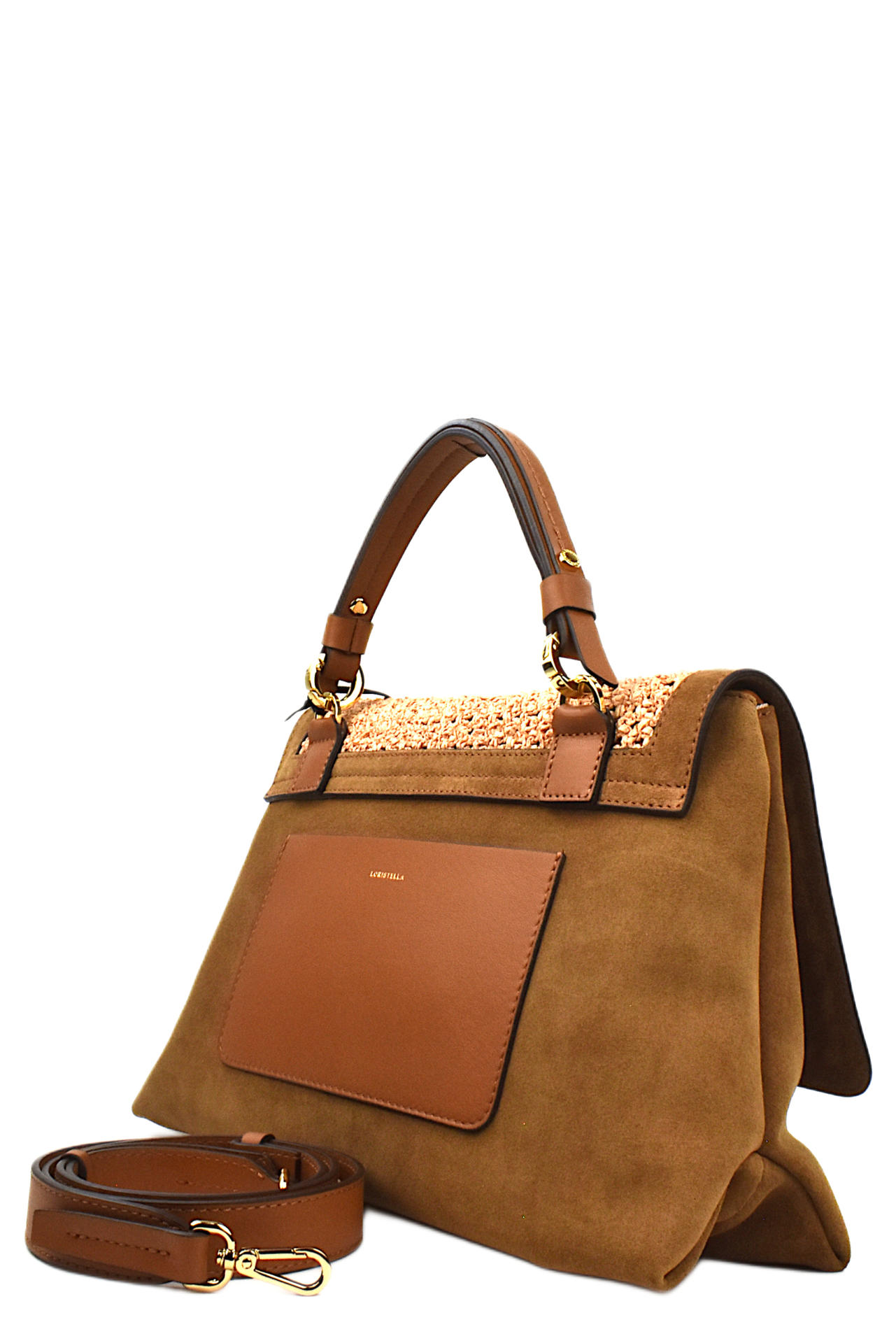 BORSA IN CAMOSCIO, PELLE E RAFFIA LAVORATA. PATTA CON ZIP INTERNA DI CHIUSURA. INTERNO FODERATO E CON TASCHE. TRACOLLA IN PELLE IN TINTA INCLUSA. MISURE 35X20X10. MADE IN ITALY