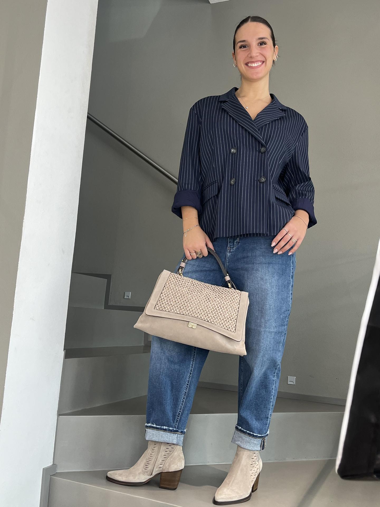 BORSA IN CAMOSCIO, PELLE E RAFFIA LAVORATA. PATTA CON ZIP INTERNA DI CHIUSURA. INTERNO FODERATO E CON TASCHE. TRACOLLA IN PELLE IN TINTA INCLUSA. MISURE 35X20X10. MADE IN ITALY