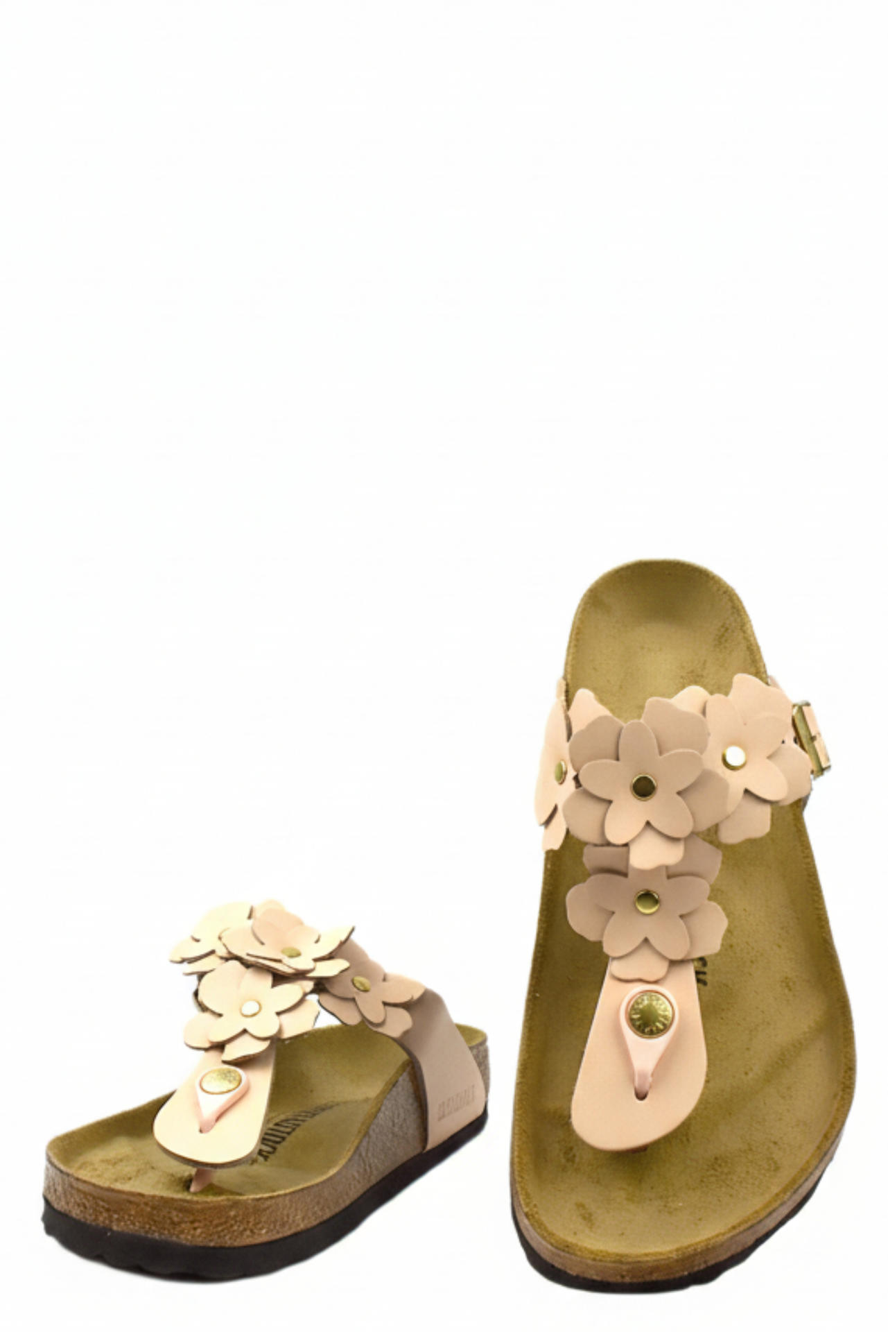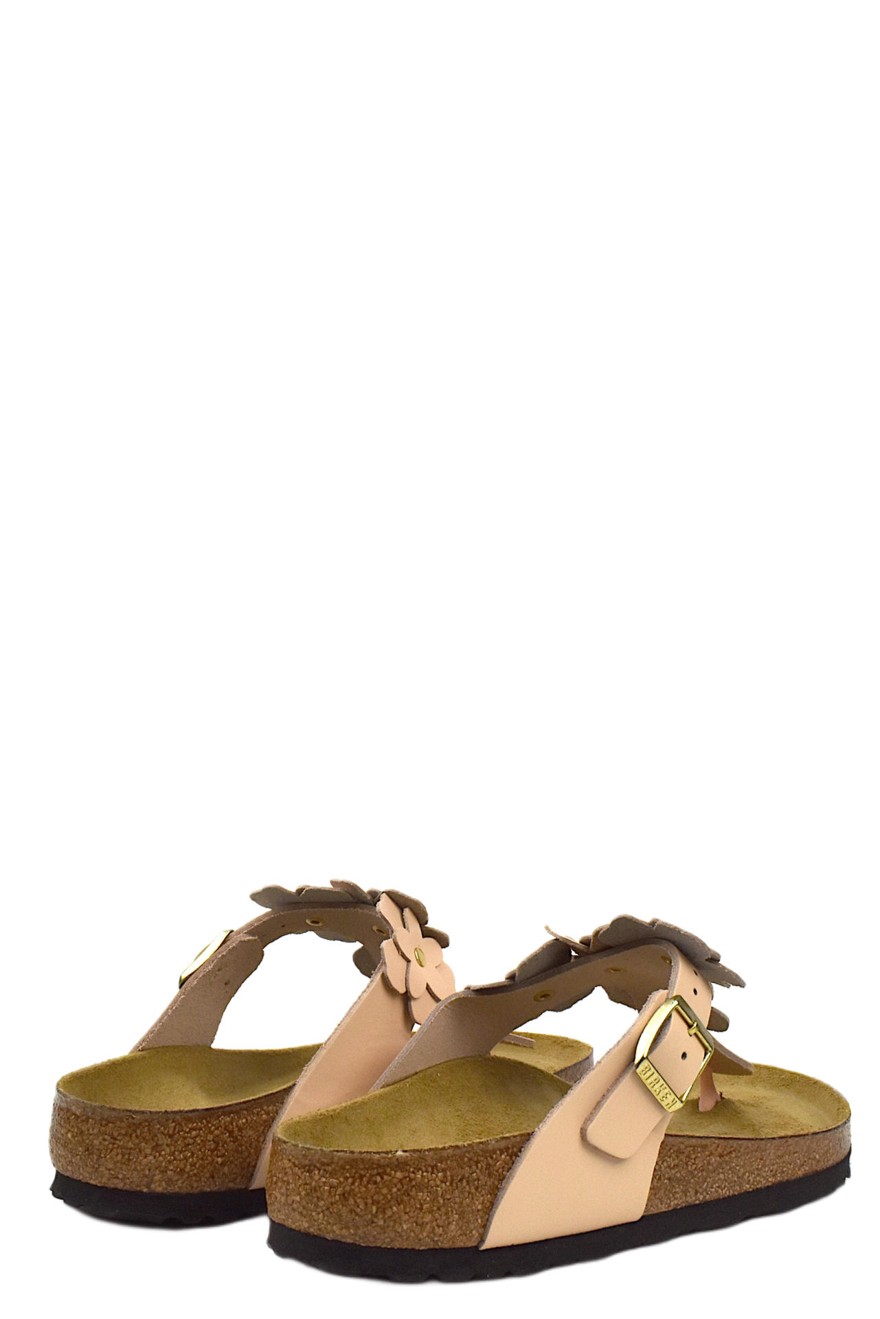 CIABATTINA GIZEH IN PELLE CON APPLICAZIONI FLOREALI E FIBBIA REGOLABILE SU LATO ESTERNO. PLANTARE DALLA FORMA ANATOMICA IN SUGHERO E LATTICE CON SOTTOPIEDE IN PELLE SCAMOSCIATA E FONDO EVA. TACCO 15.
