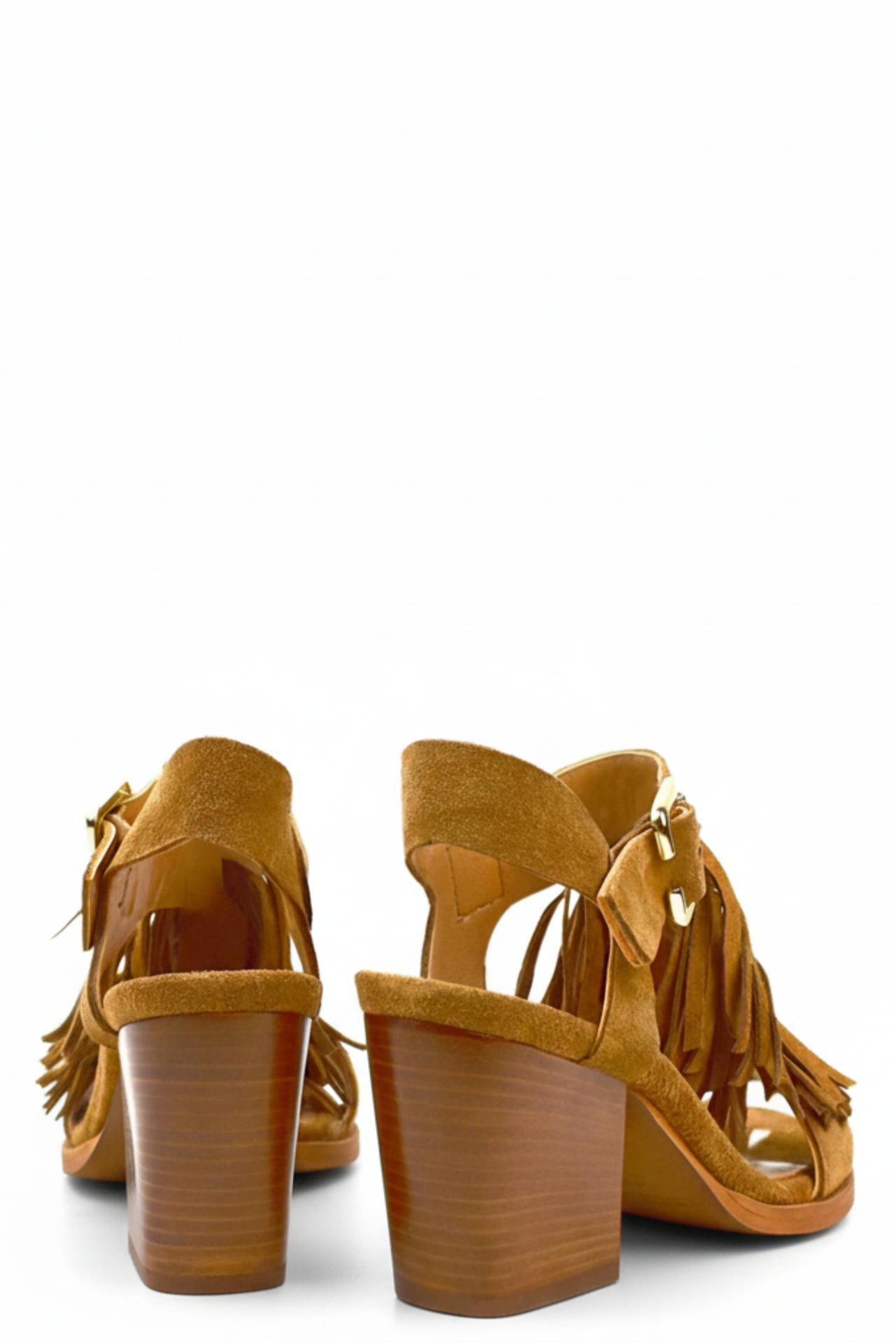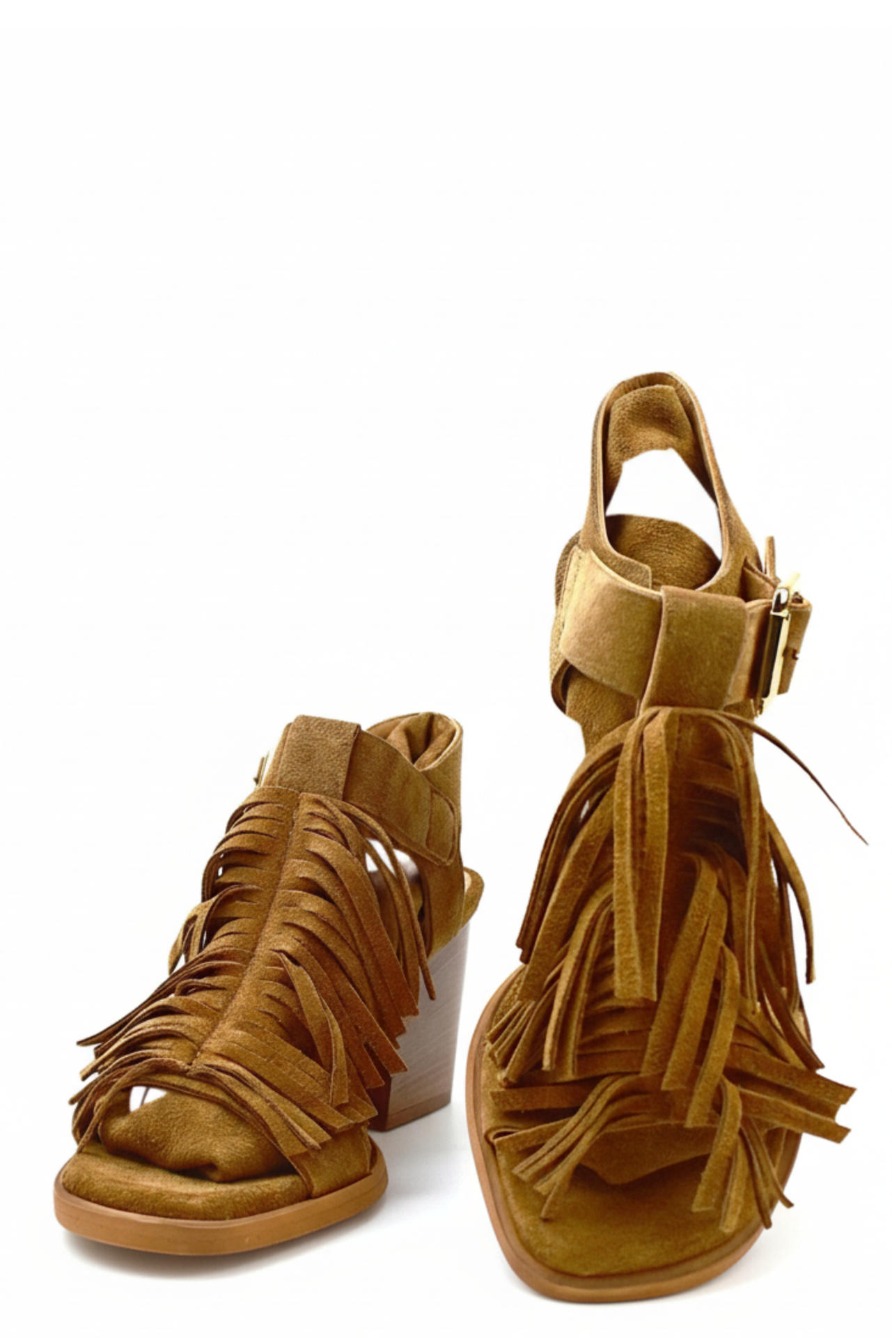 SANDALO IN CAMOSCIO CON FRANGE E FIBBIA REGOLABILE. MORBIDO SOTTOPIEDE. TACCO 80, FONDO GOMMA. MADE IN ITALY