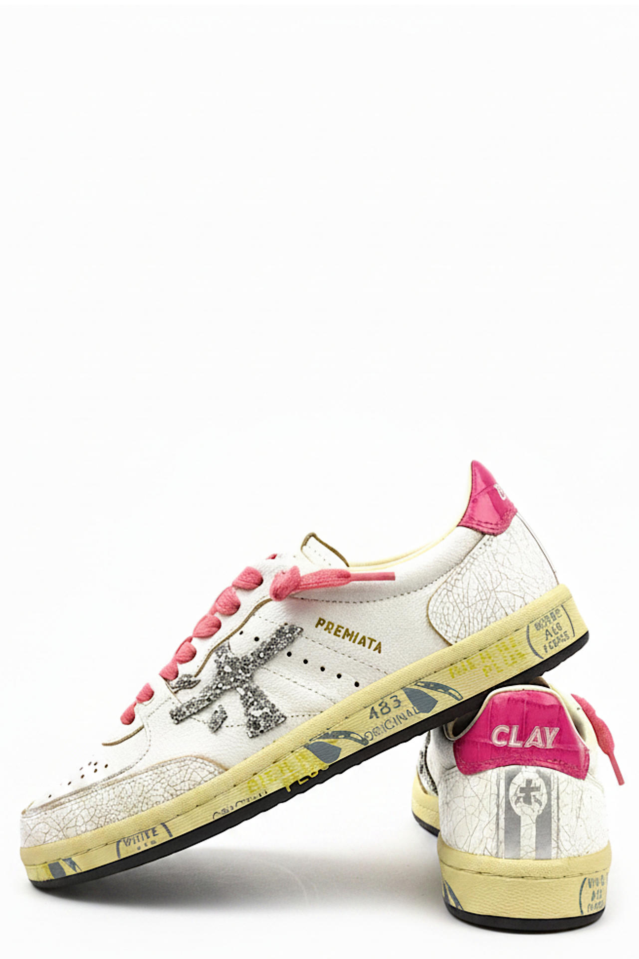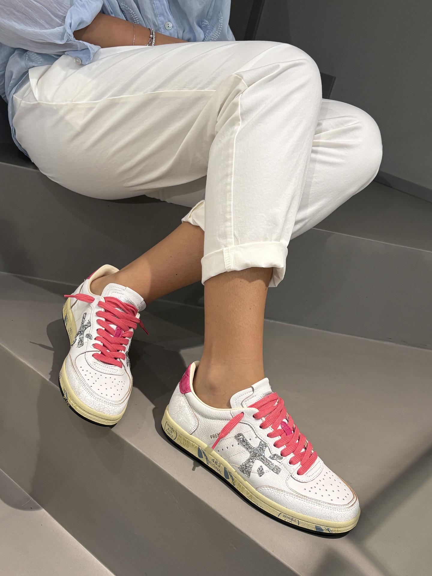 SNEAKER STRINGATA IN PELLE E PELLE CRACCATA AGLI ESTREMI. DETTAGLIO IN GLITTER LATERALE E IN PELLE STAMPATA COCCO FUXIA SUL RETRO. MORBIDO PLANTARE INTERNO ESTRAIBILE. TACCO 25, FONDO GOMMA.