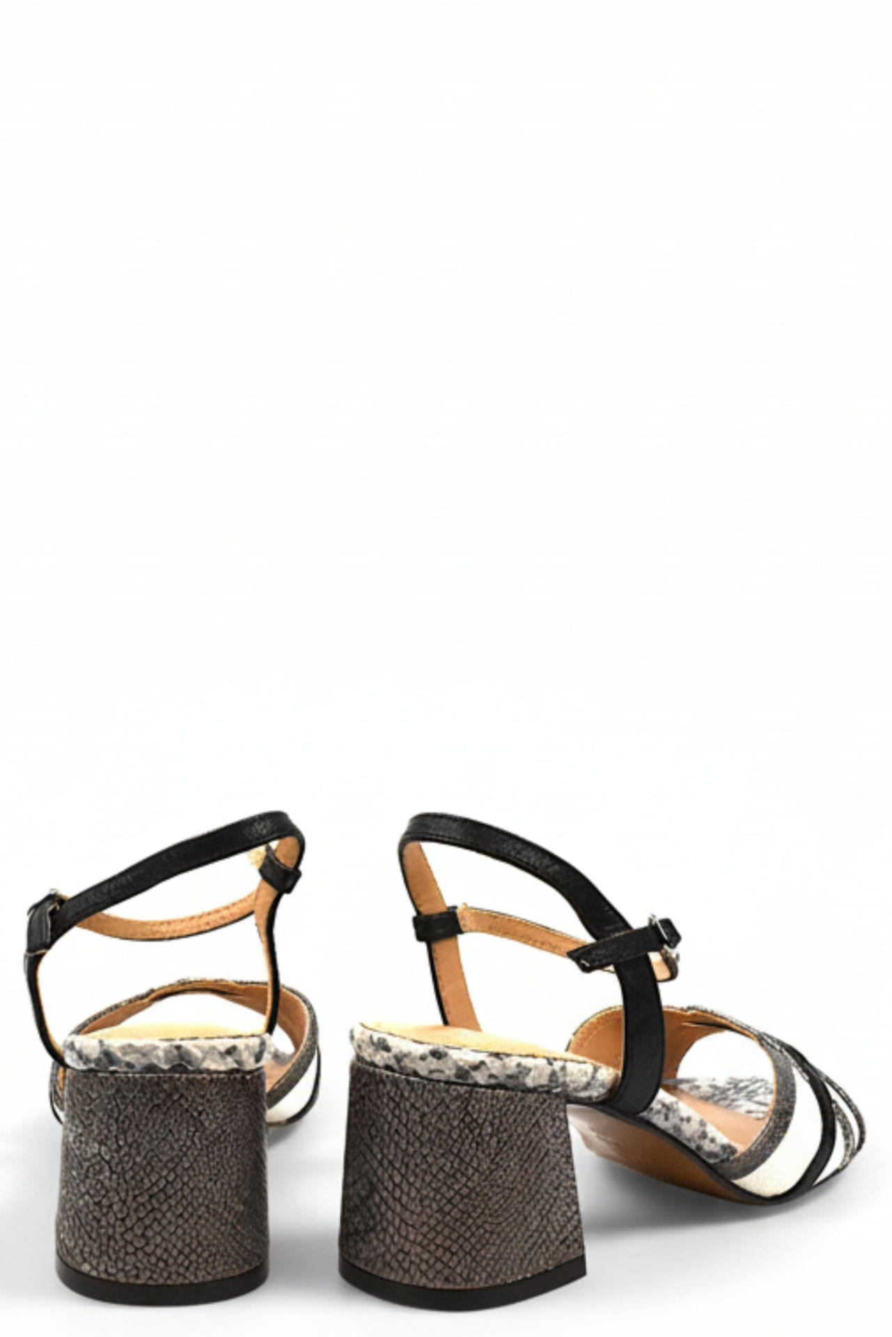 SANDALO IN PELLE E SIMIL PELLE CON RIFINITURE LAVORATE E CINTURINO ALLA CAVIGLIA. TACCO 55, FONDO GOMMA.