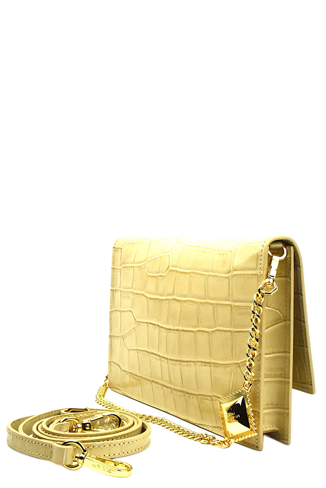 POCHETTE IN PELLE STAMPATA EFFETTO COCCO VERNICIATA, CON PATTA E BOTTONE MAGNETICO DI CHIUSURA. TRACOLLA IN CATENINA E TRACOLLA LUNGA IN PELLE IN TINTA INCLUSA (ENTRAMBE DOTATE DI MOSCHETTONI AI LATI PER POTERLE STACCARE). INTERNO FODERATO E CON TASCHE. MISURE 23X16X3,5