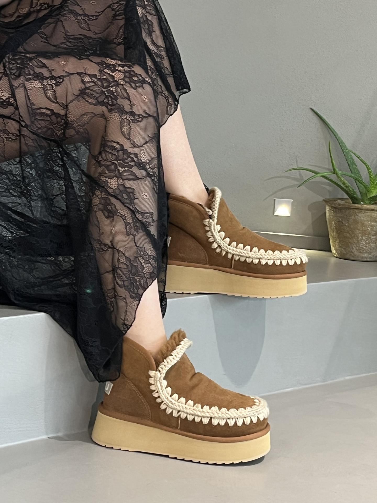 NOVITA' IL MINI ESKIMO PLATFORM BOOT E' SAPIENTEMENTE REALIZZATO A MANO IN LUSSUOSO CAMOSCIO E PRESENTA LE CUCITURE IN LANA ALL'UNCINETTO DISTINTIVE DI MOU. INCREDIBILMENTE CONFORTEVOLE E RESISTENTE CON SUOLA IN GOMMA EVA. TACCO 45, PLATFORM 35, FONDO GOMMA.
