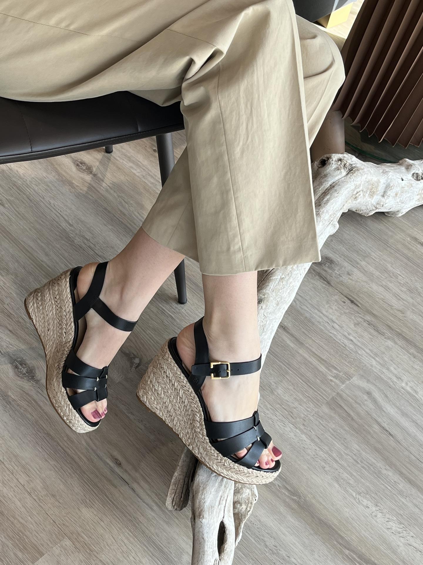 SANDALO IN PELLE CON FIBBIA DI CHIUSURA. ZEPPA IN CORDA INTRECCIATA. TACCO 100, PLATFORM 30, FONDO GOMMA.