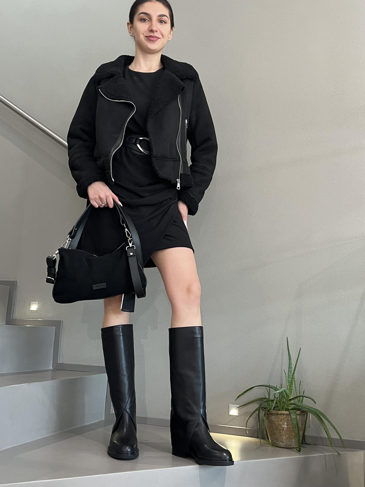 BORSA IN CAMOSCIO E PELLE CON ZIP DI CHIUSURA. INTERNO FODERATO CON TASCHE E FESSURE PER TESSERE. TRACOLLA IN PELLE IN TINTA INCLUSA CON MOSCHETTONI AGLI ESTREMI. MISURE 30X20X4. MADE IN ITALY