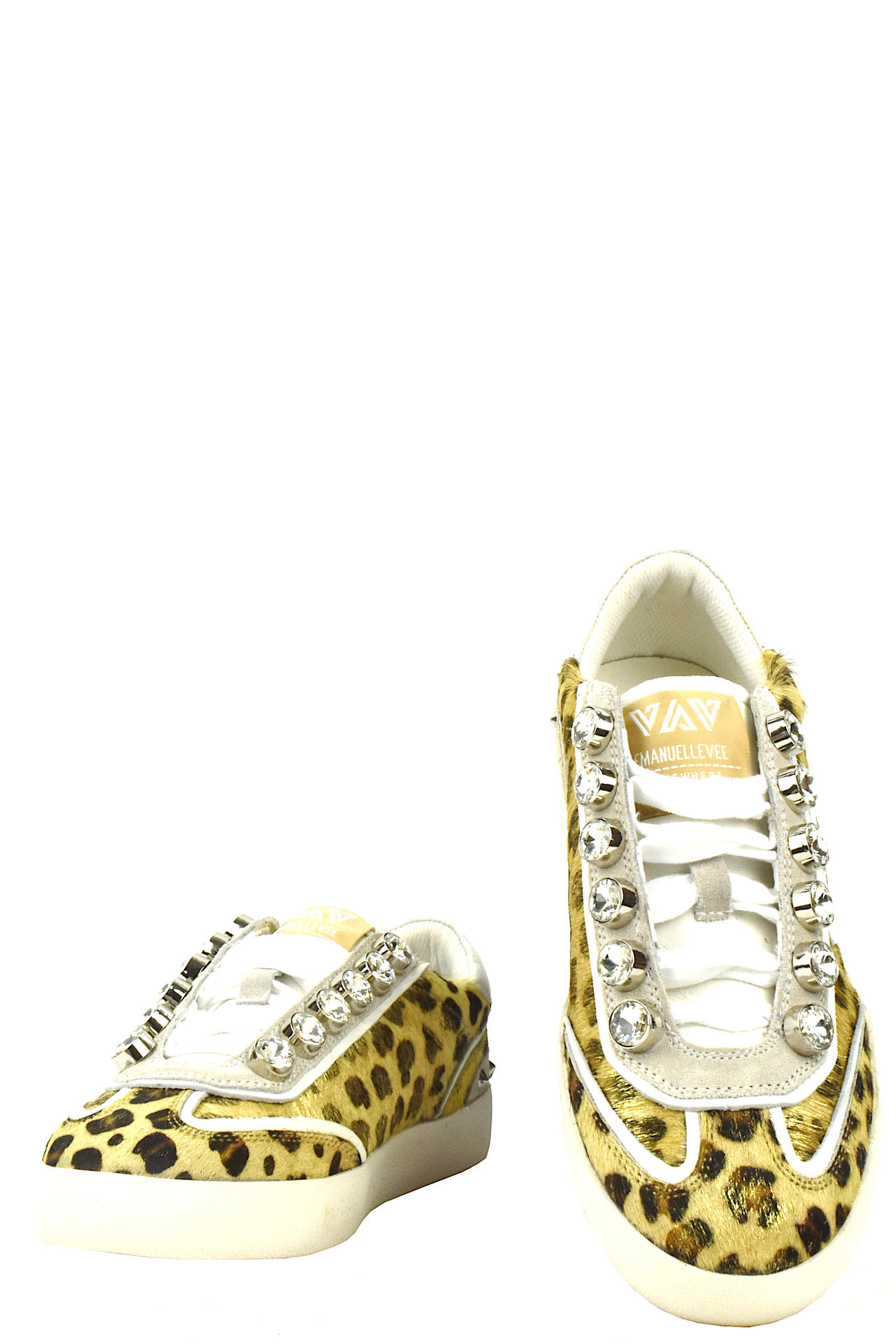 SNEAKER STRINGATA IN PELLE E CAVALLINO ANIMALIER CON DETTAGLI IN CAMOSCIO E BORCHIE. TACCO 25, FONDO GOMMA.
