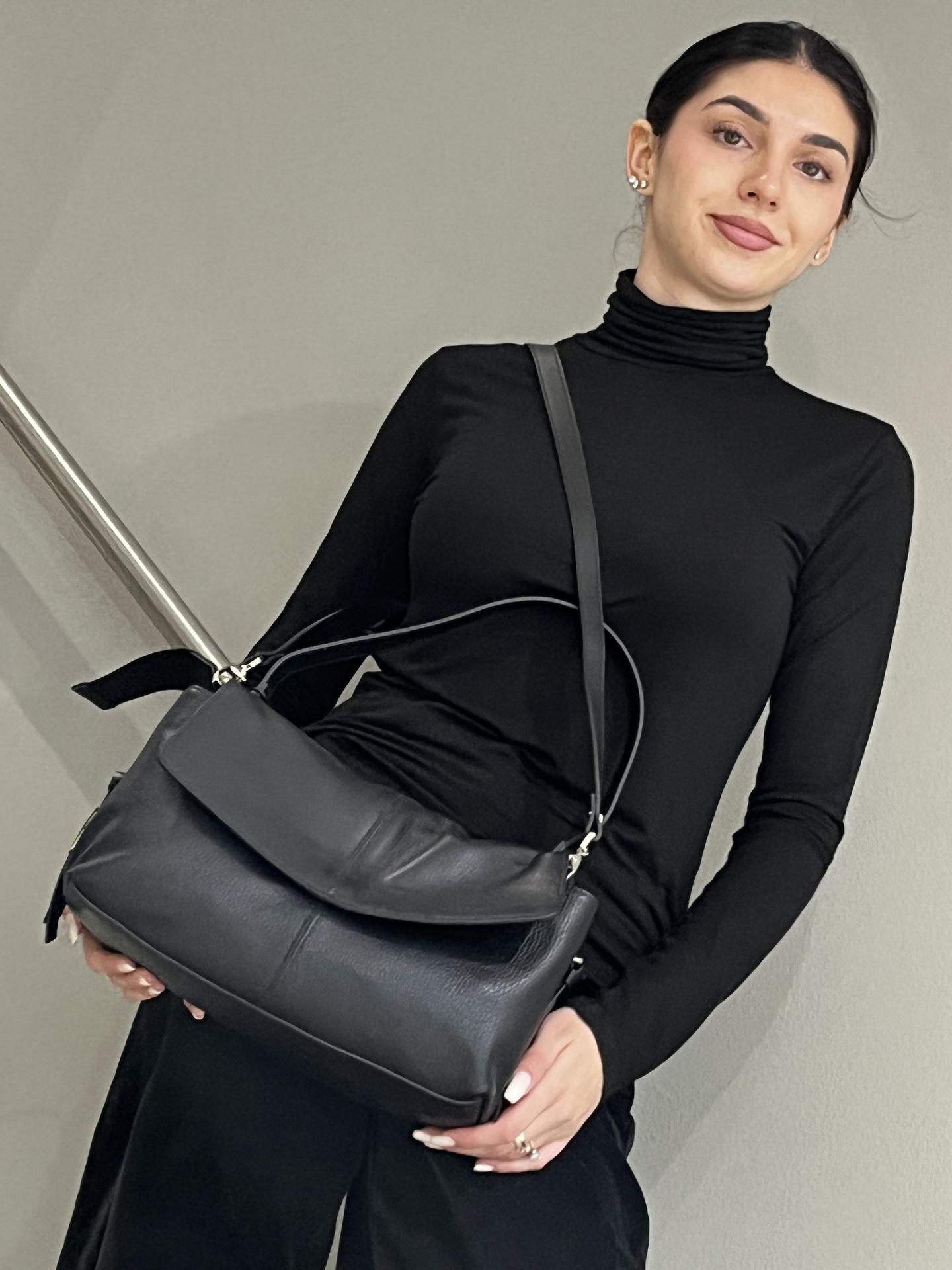 BORSA IN PELLE CON PATTA E BOTTONE MAGNETICO DI CHIUSURA. INTERNO FODERATO E CON TASCHE. TRACOLLA IN PELLE INCLUSA, CON MOSCHETTONI AGLI ESTREMI. MISURE 29X16X11