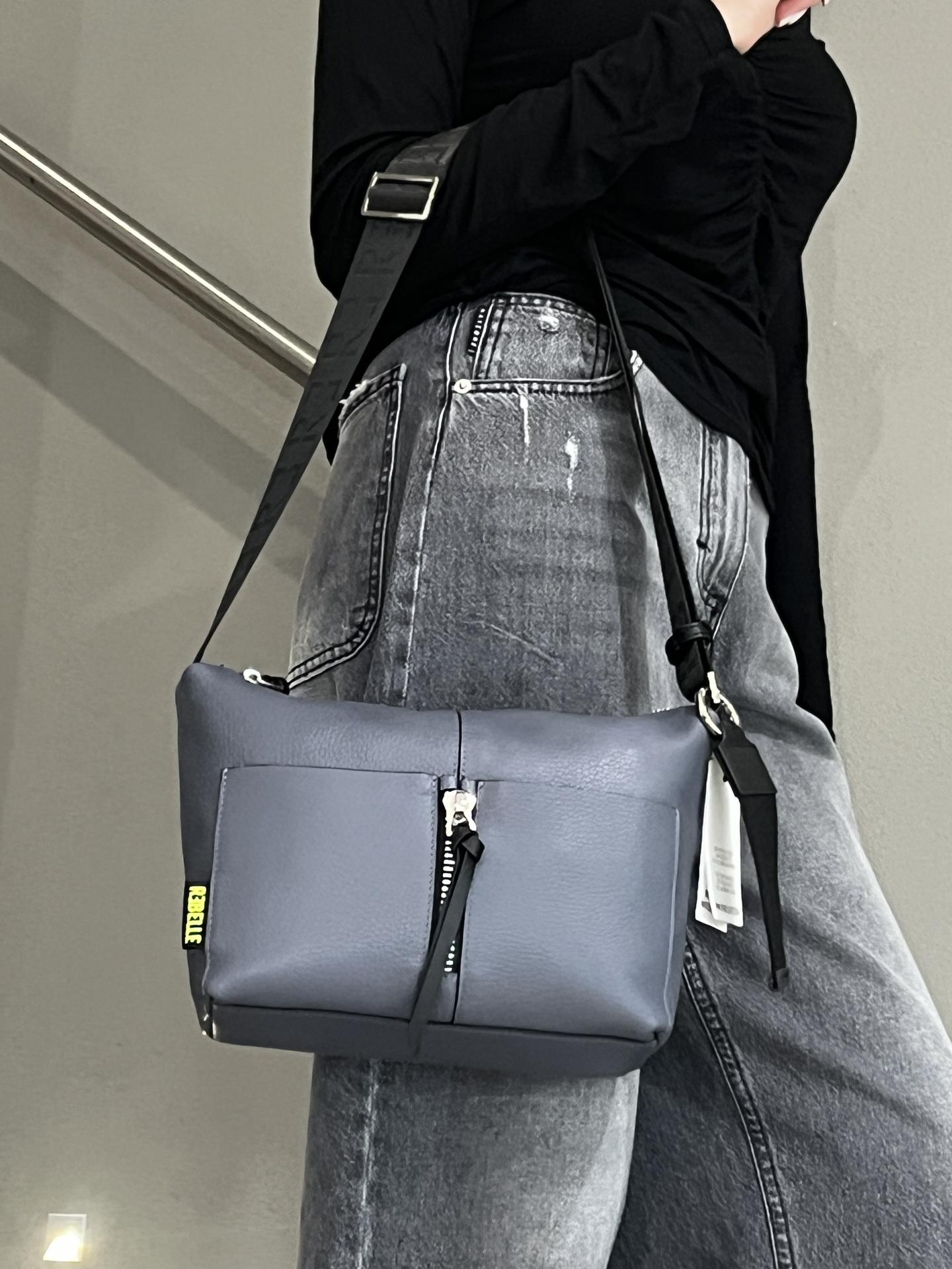 BORSA IN PELLE CON ZIP DI CHIUSURA. INTERNO FODERATO E CON TASCHE. TRACOLLA IN TESSUTO LOGATO REGOLABILE. MISURE 24X19X10,5