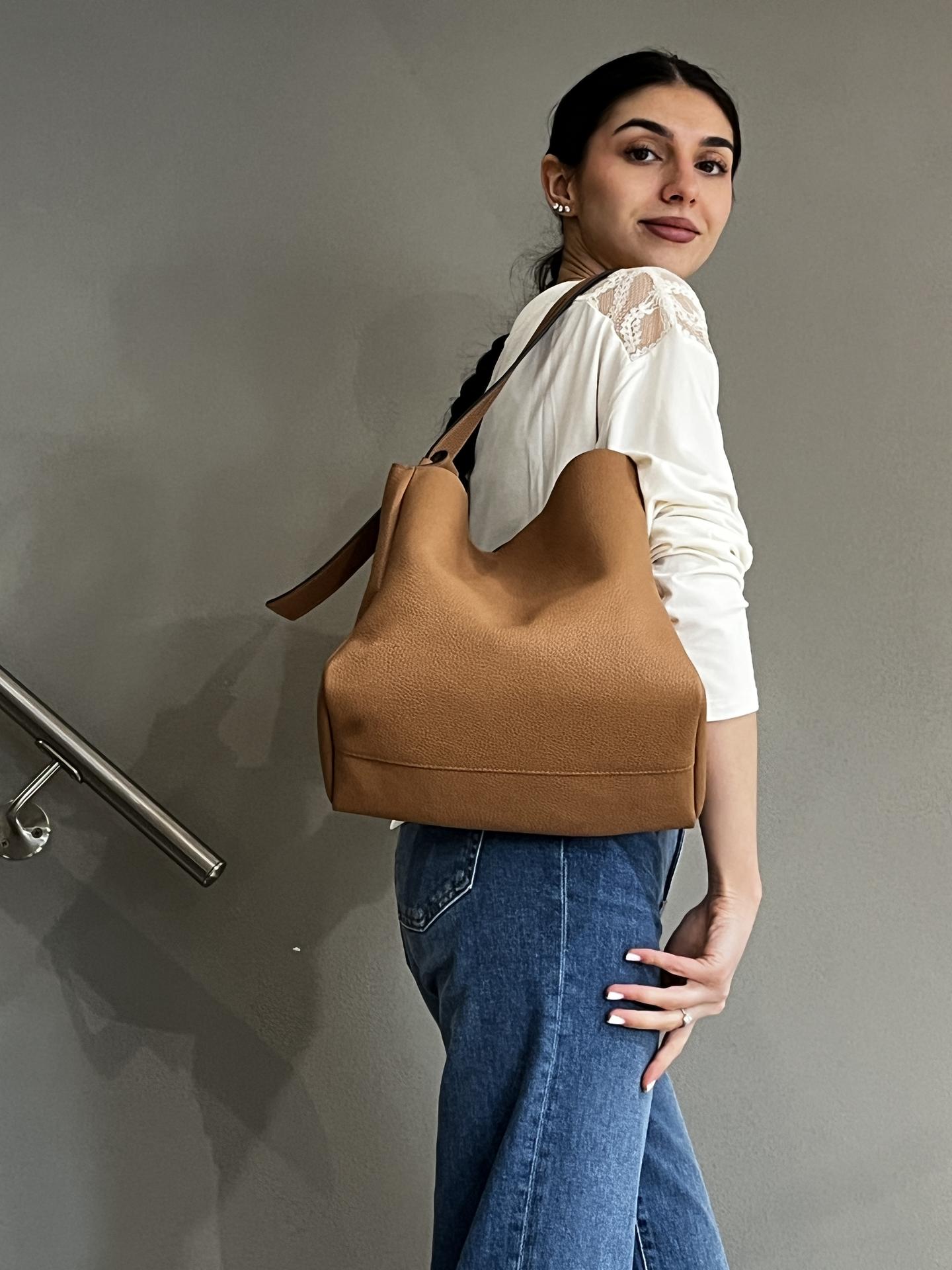 BORSA IN PELLE CON BOTTONE MAGNETICO DI CHIUSURA. INTERNO FODERATO E CON TASCHE. TRACOLLA IN PELLE IN TINTA INCLUSA. MISURE 28X26X15. MADE IN ITALY