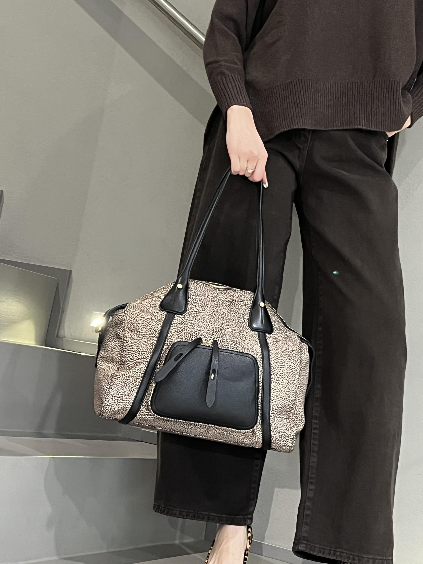 BORSA SHOPPING IN TESSUTO CON STAMPA TAPIRO E PELLE. AMPIA APERTURA CON ZIP. INTERNO FODERATO E CON TASCHE. TASCA FRONTALE CON ZIP. MISURE 36X29X19