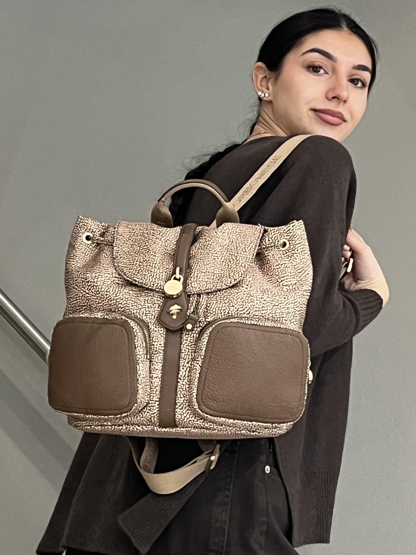 ZAINO IN TESSUTO TECNICO CON STAMPA TAPIRO E RIFINITURE IN PELLE. PATTA CON GANCIO DI CHIUSURA E COULISSE. INTERNO FODERATO. SPALLACCI IN TESSUTO REGOLABILI. TASCHE FRONTALI CON ZIP. MISURE 23X25X13